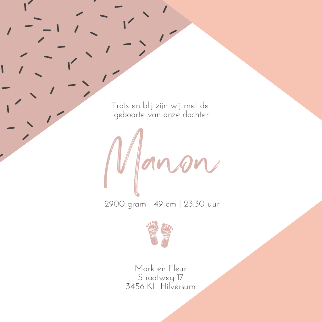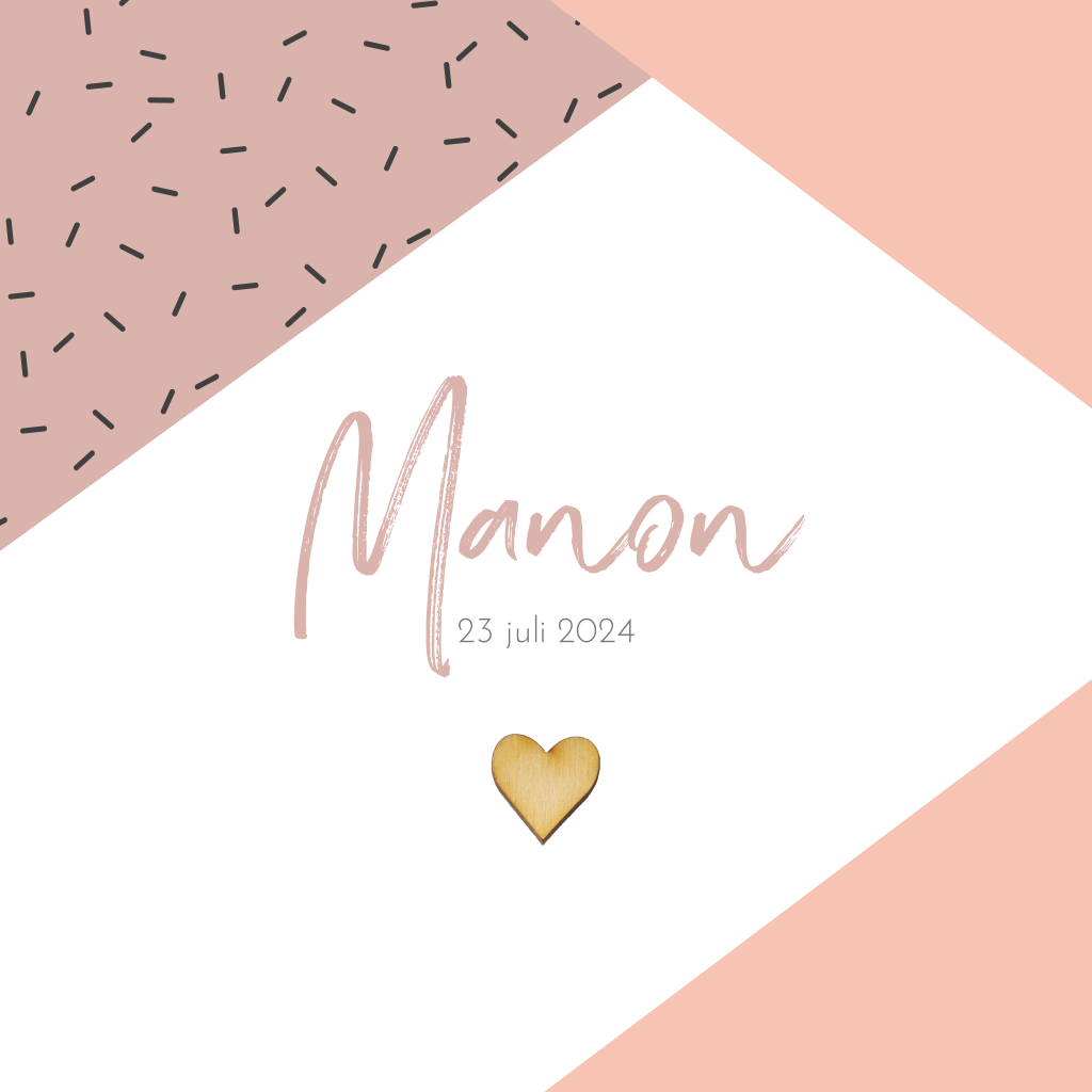 Hip geometrisch geboortekaartje meisje met confetti en echt houten hartje. (3566) LET OP! Bij de proefdruk en eindbestelling wordt GEEN voorbeeld vormpje geleverd. Het houten vormpje op dit kaartje wordt niet mee gedrukt, deze is ter voorbeeld. Op die plek kun je straks zelf het Γ©chte houten vormpje plakken die je in het bestelproces bij dient te bestellen.