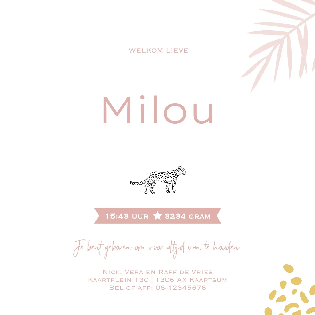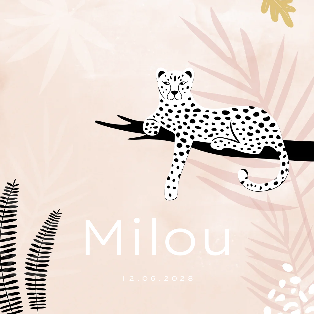 Hip geboortekaartje meisje met luipaard op tak