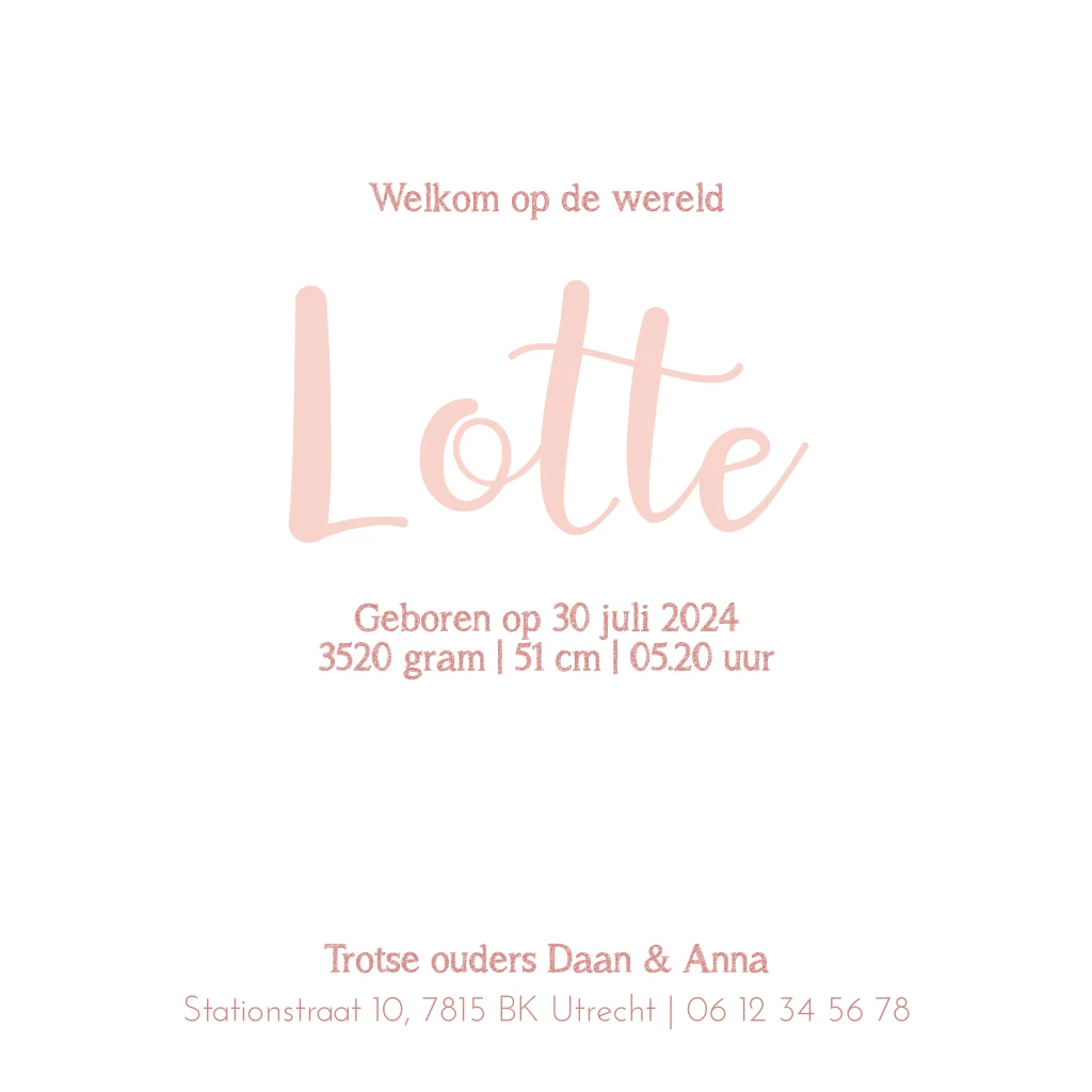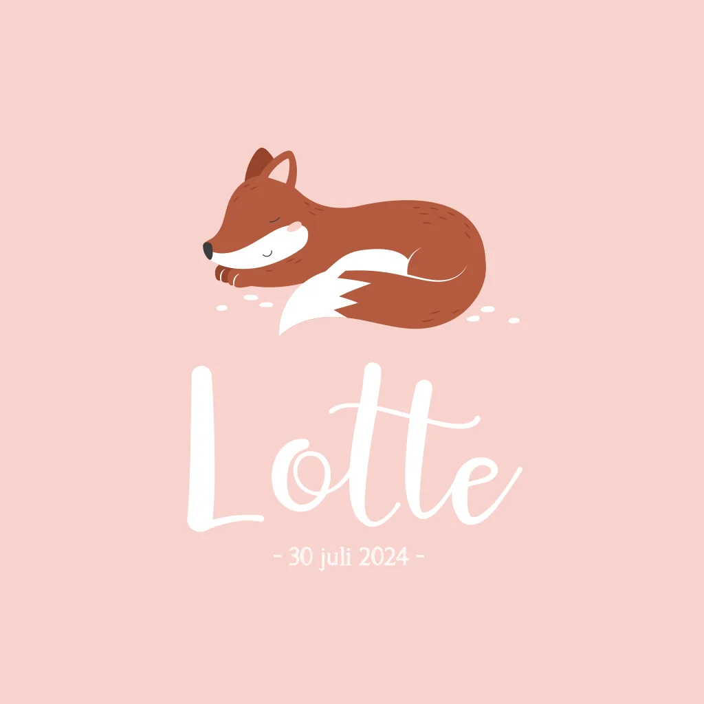 Hip geboortekaartje voor een meisje in zacht roze kleur. Met een lief vosje en een regenboog aan de binnenzijde. (3715)