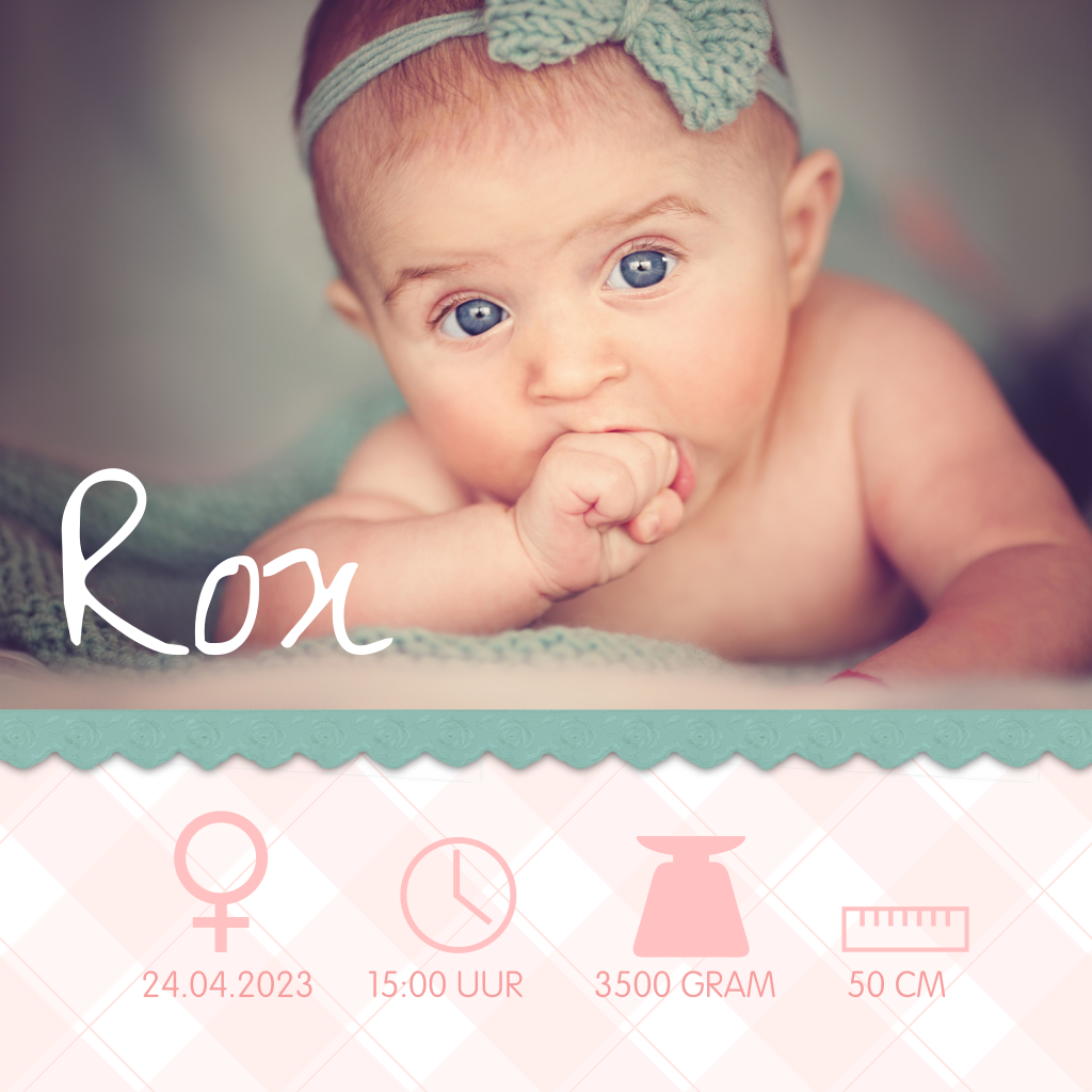 Dit lieve geboortekaartje gaat mee met de trends: mintgroen en perzikkleurig. Dat ziet het gaaf uit! Met de pictogrammen voor geboortetijd, gewicht en lengte laat je de geboortedetails weten en achterop vind je lieve getekende hartjes.