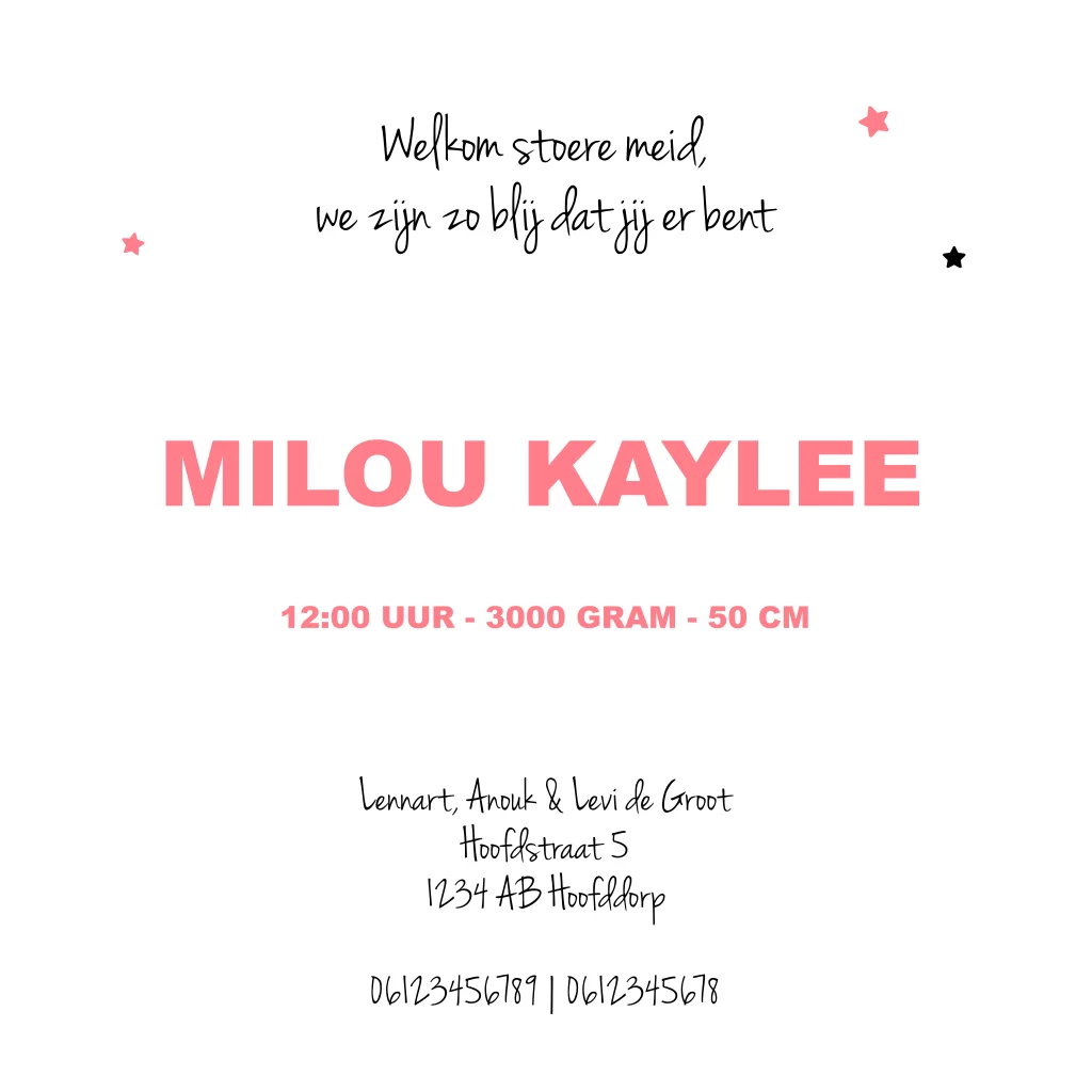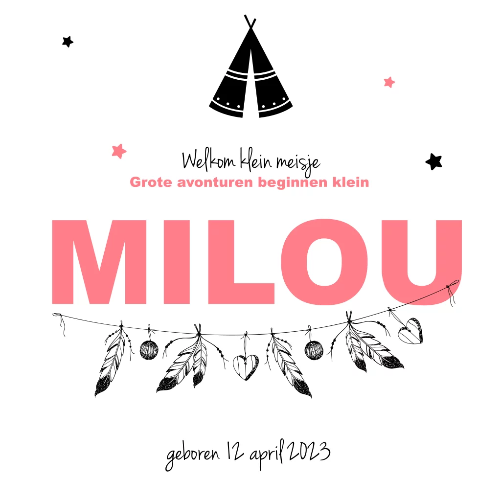 Een leuk geboortekaartje voor een meisje met slinger en een tipitent. Hip zwart-wit met peach tinten.