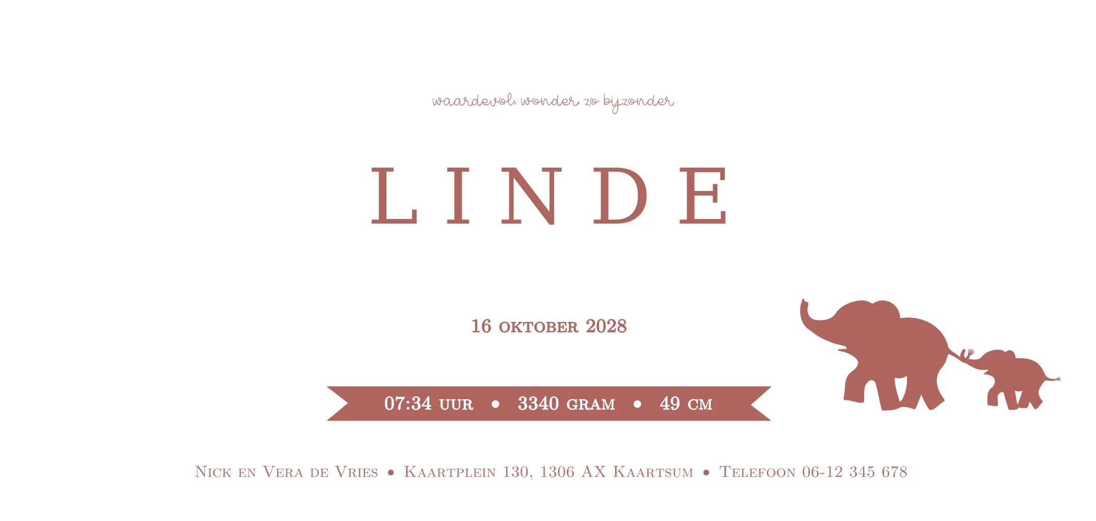 Geboortekaartje voor een meisje. Hip voor een tweede kindje met olifantjes.