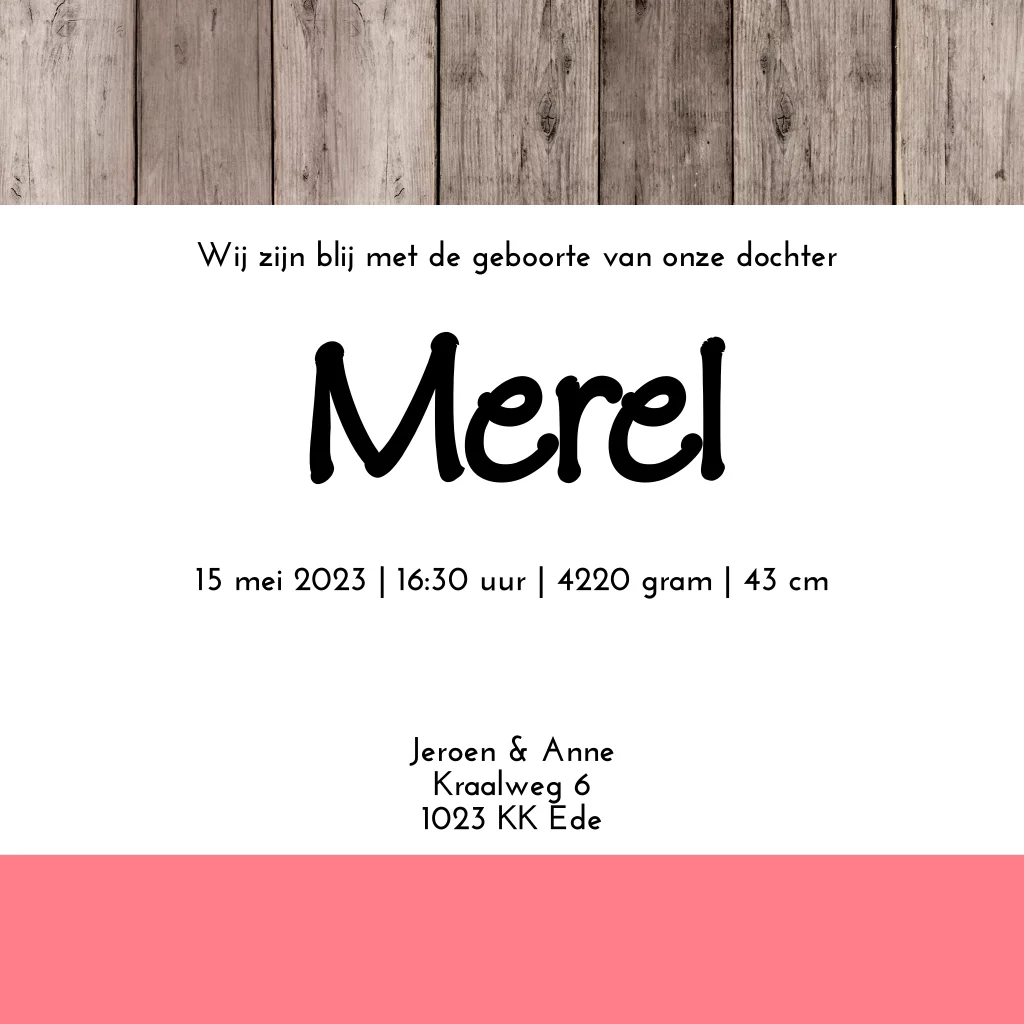 Hip meisjes geboortekaartje hout met ruitjes. de kleuren van de ruitjes zijn naar wens aan te passen. (154)
