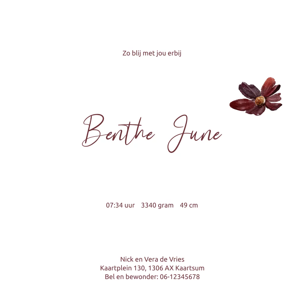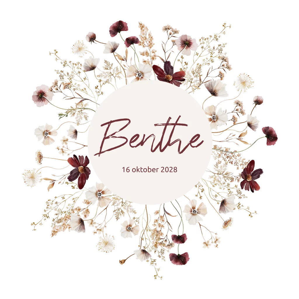 Hip meisjes geboortekaartje in aardetinten met veld bloemen krans.