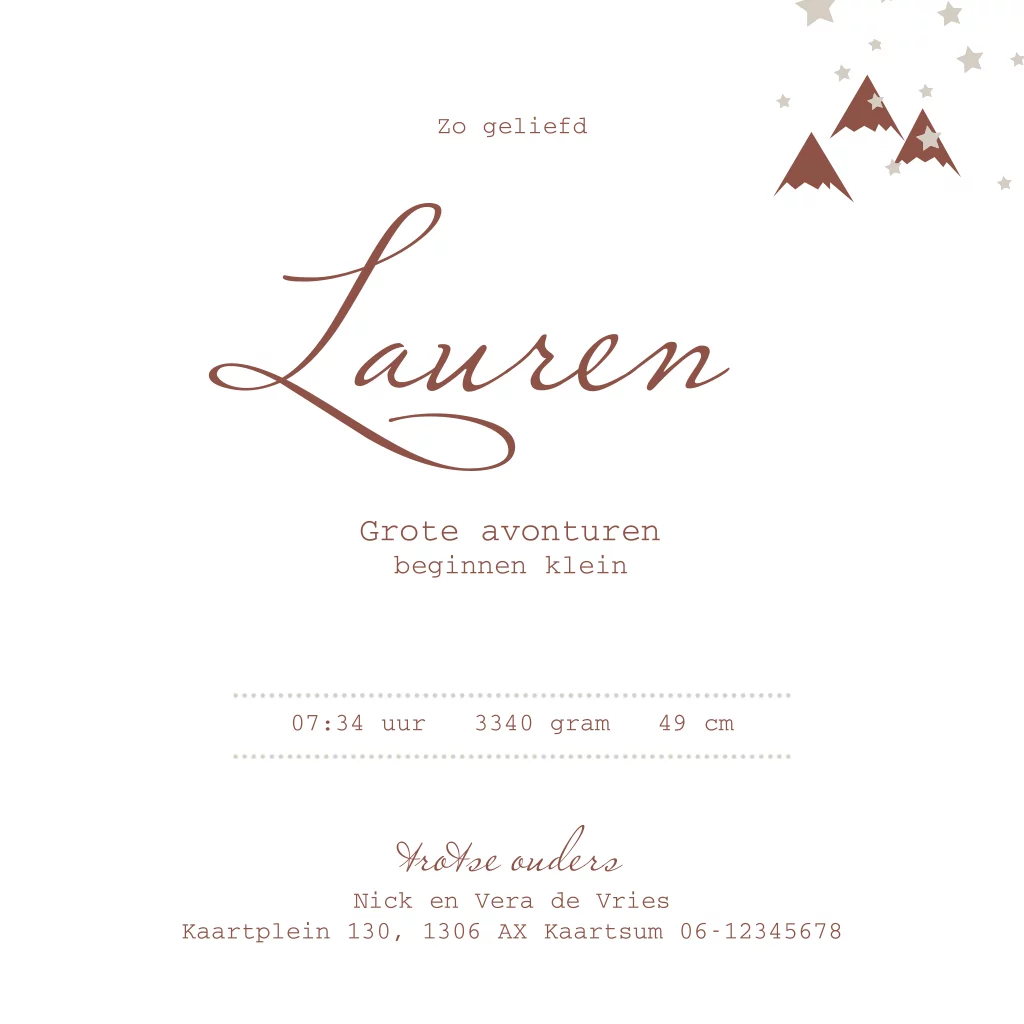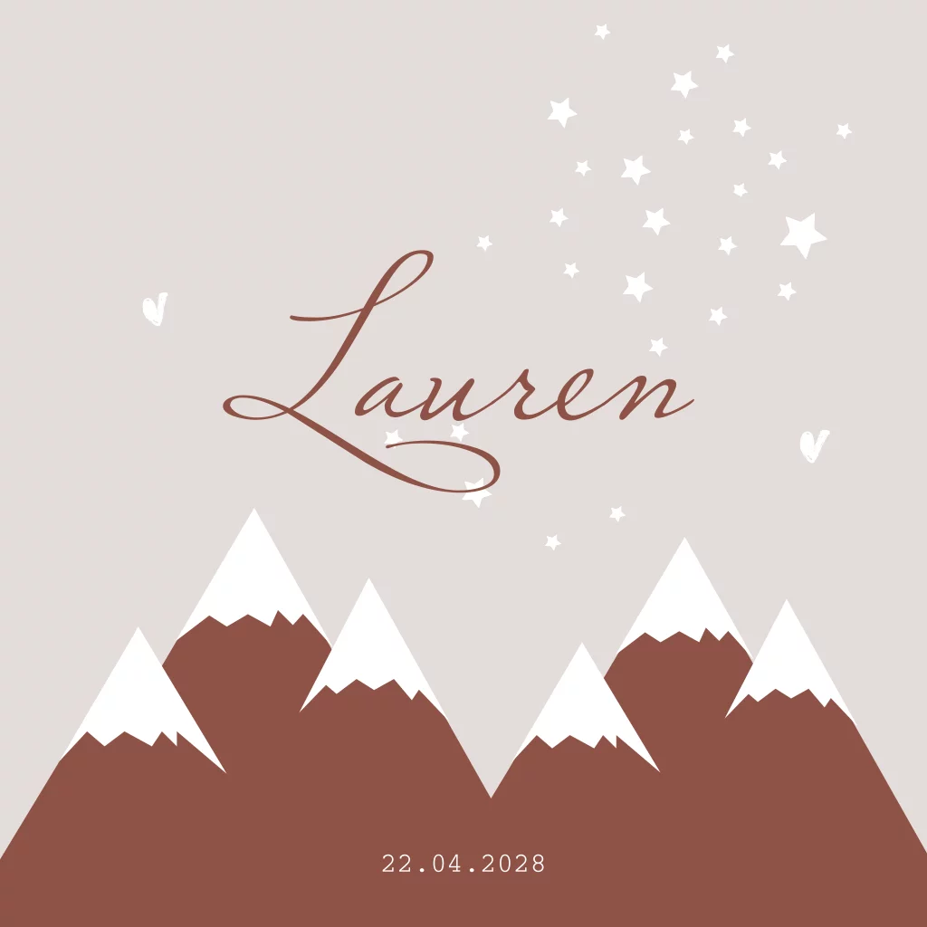 Geboortekaartje hip voor een meisje. Roestbruine bergen. Een echt winter kaartje.