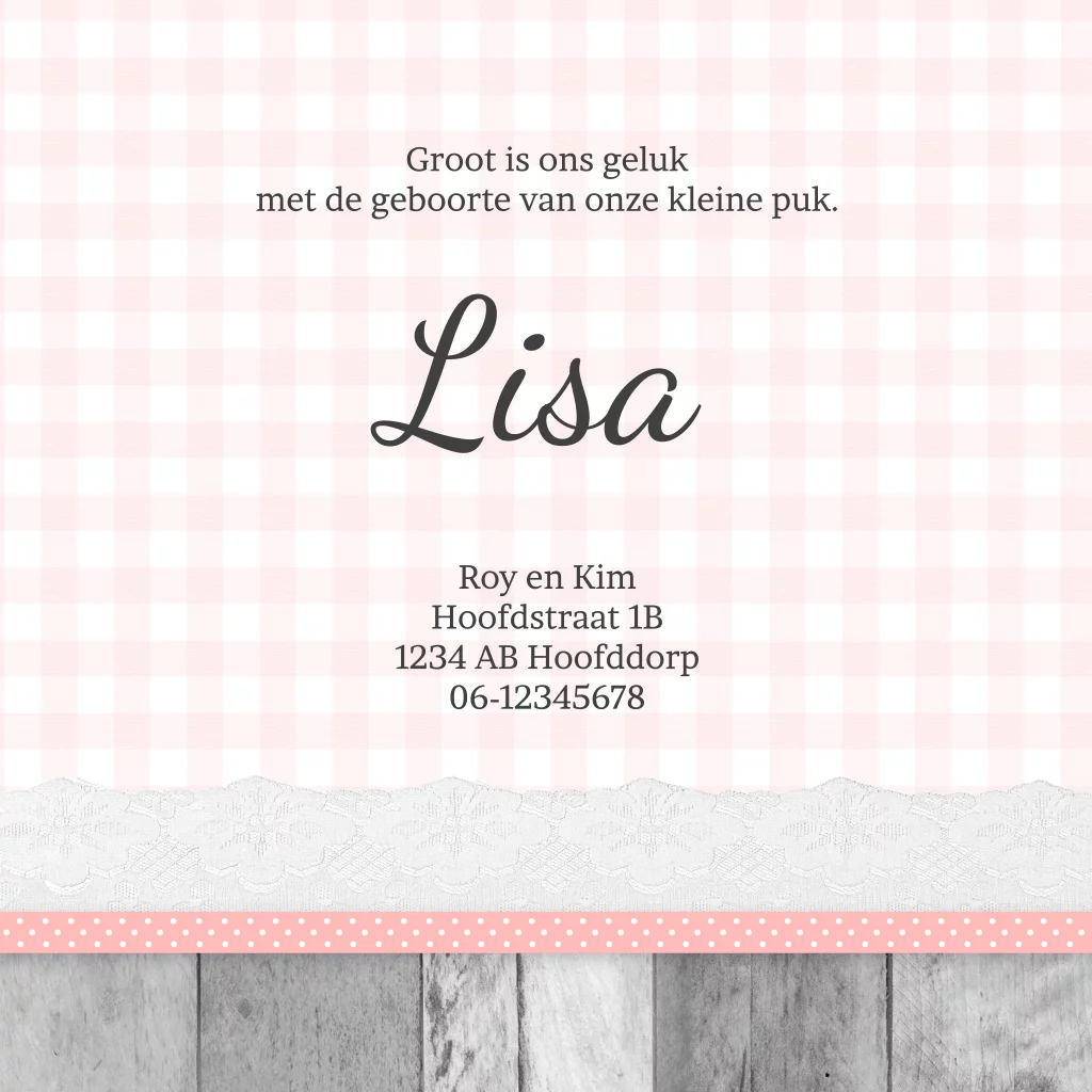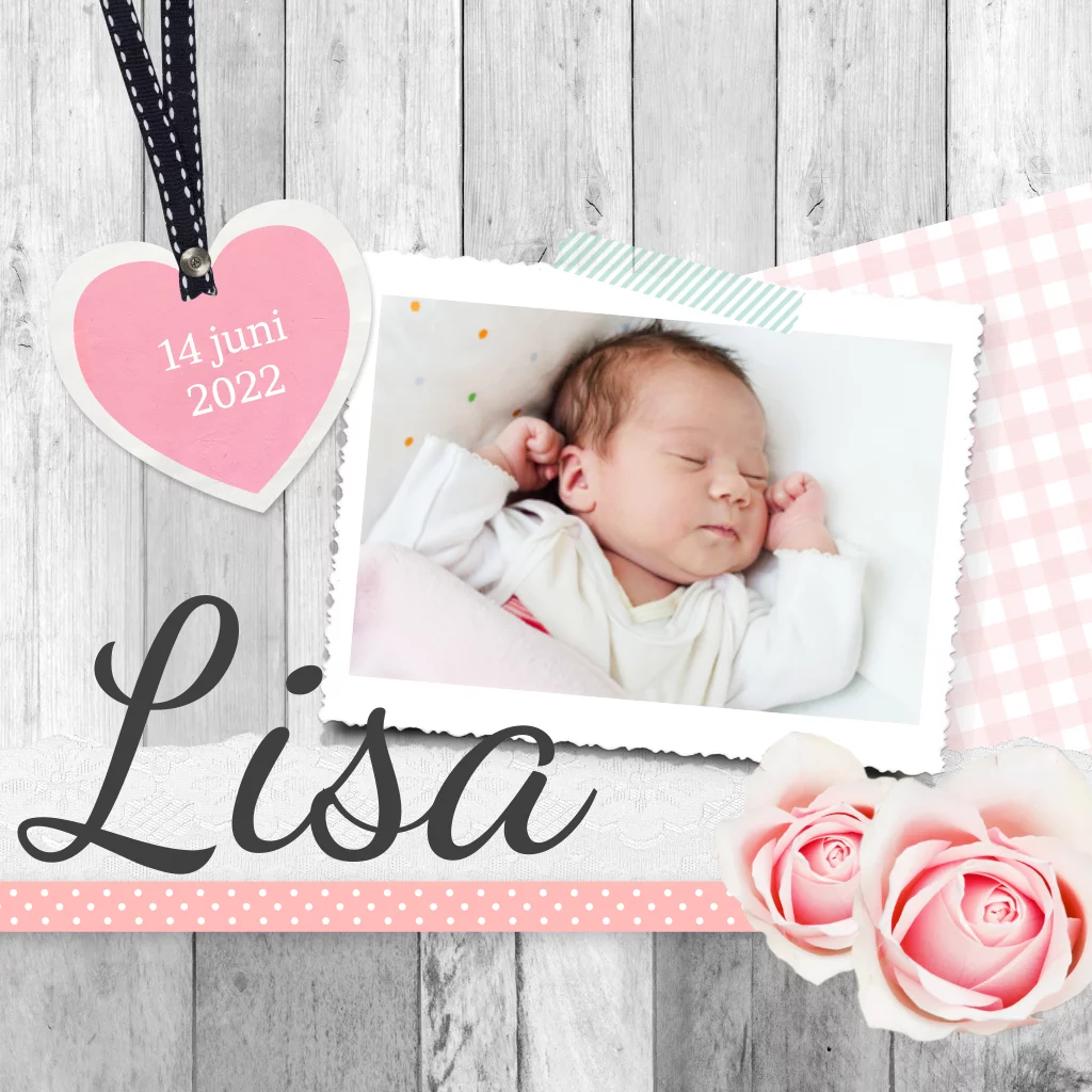 Dit stoere geboortekaartje heeft een vintage tintje doordat er allerlei lagen over elkaar zijn gelegd: een foto staat te midden van een ruitenstofje, een hart, kant, roze roosjes een lintje en hout.