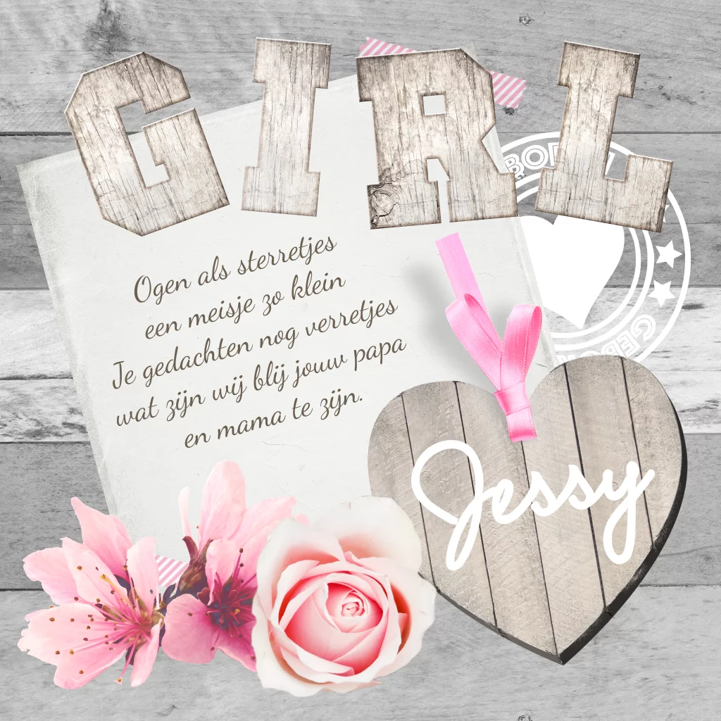 Dit stoere geboortekaartje voor een meisje heeft een romantische look. Het hartje met het strikje en de bloemetjes staan op het briefje waar je een mooi gedichtje op kunt schrijven. Op de achtergrond zie je nog een geboortestempel.
