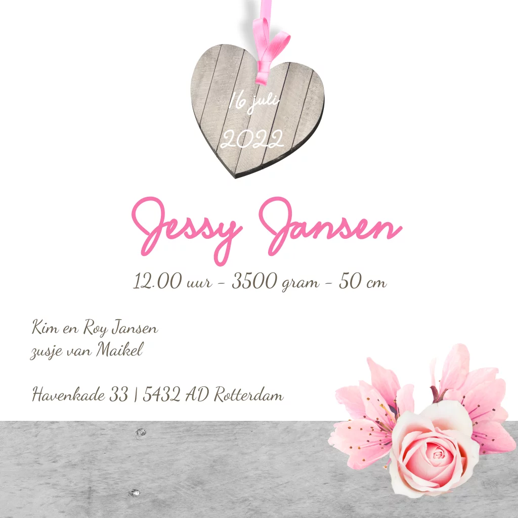 Geboortekaartje met houten hartje en bloemen