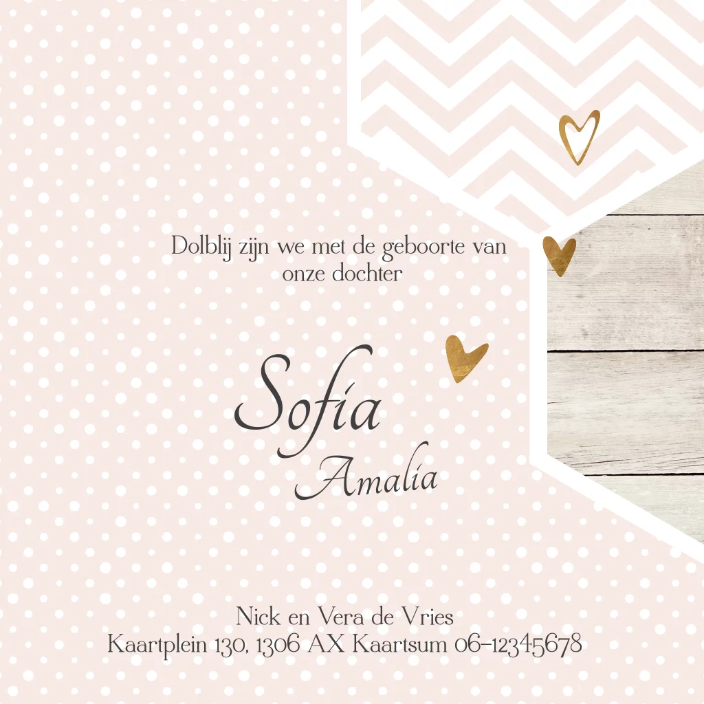 Kaartje geboorte dochter met pastel roze en hout patroon