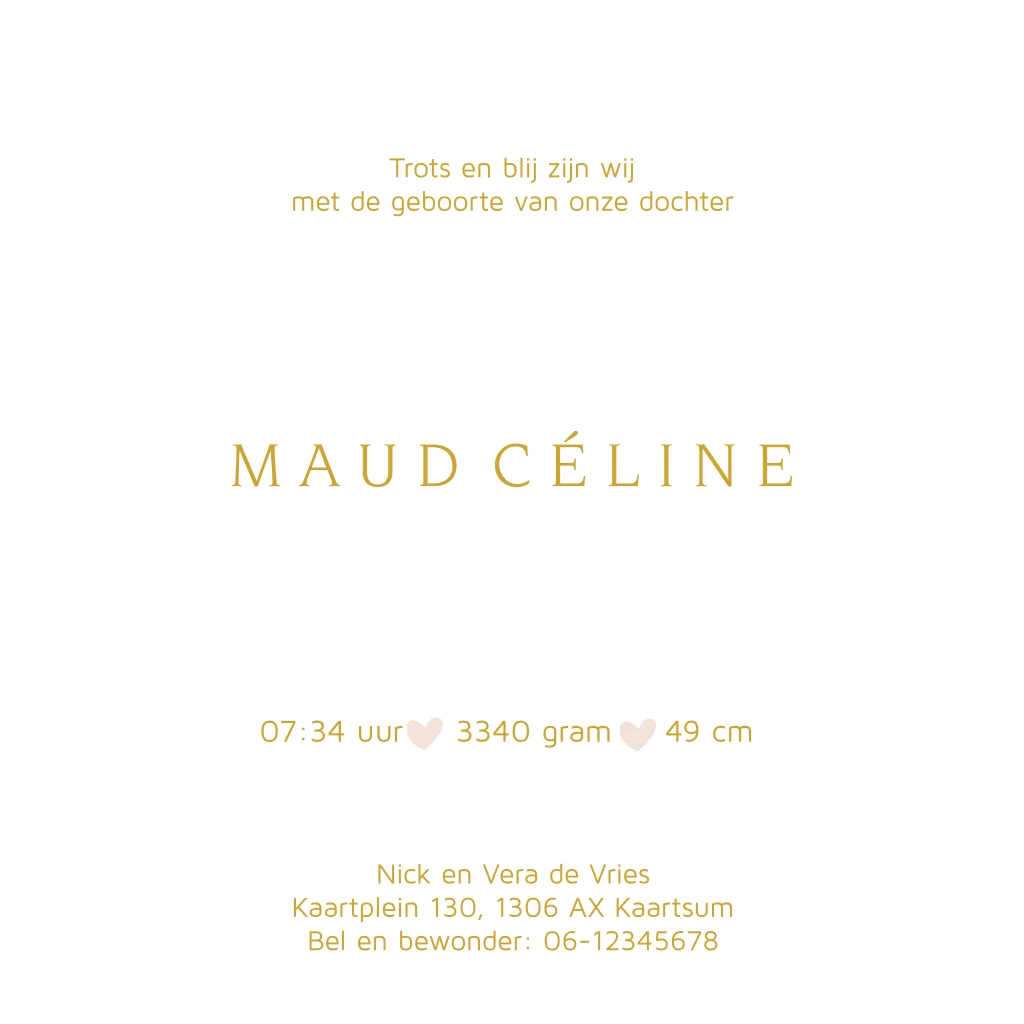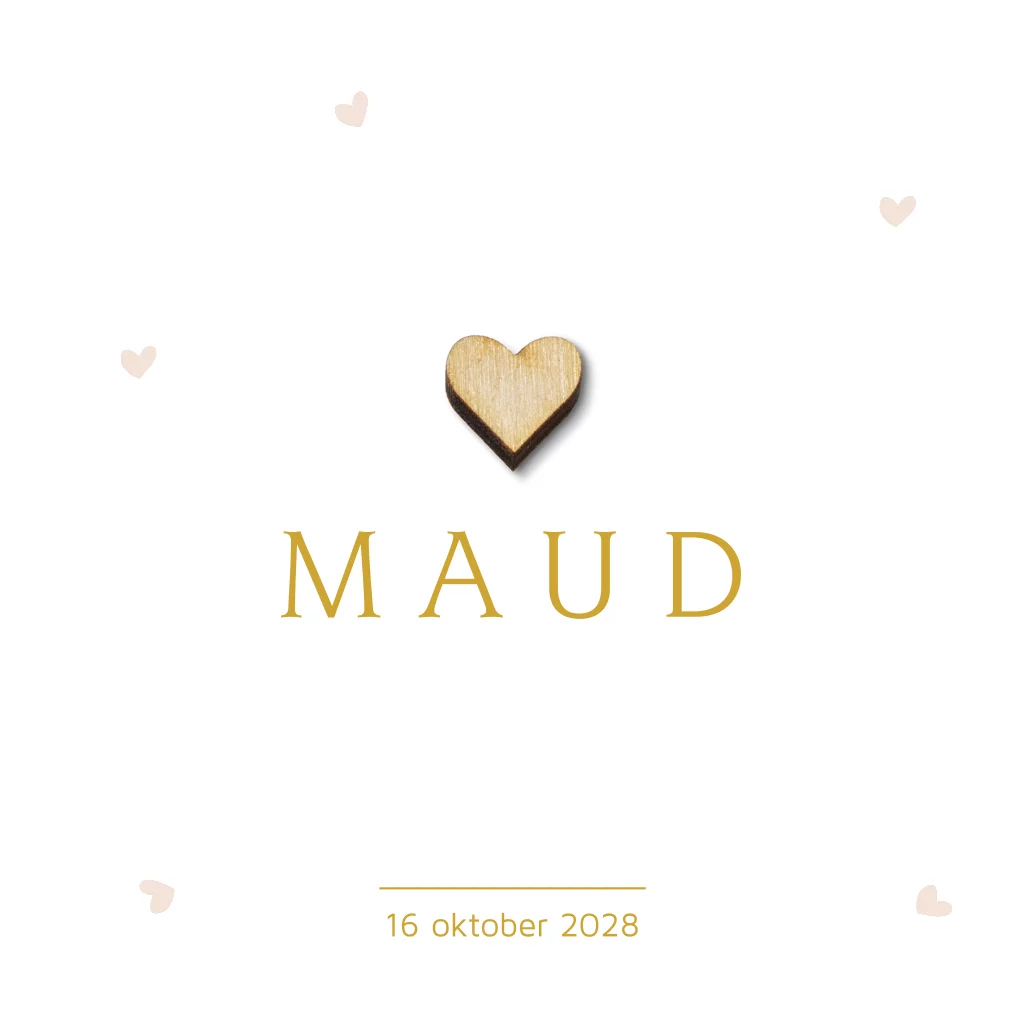 Geboortekaartje klassiek voor een meisje met een echt houten hartje. LET OP: Het houten vormpje op dit kaartje wordt niet mee gedrukt, deze is ter voorbeeld. Op die plek kun je straks zelf het Γ©chte houten vormpje plakken. Bij je proefdruk kun je een voorbeeldsetje met alle houten vormpjes bestellen.