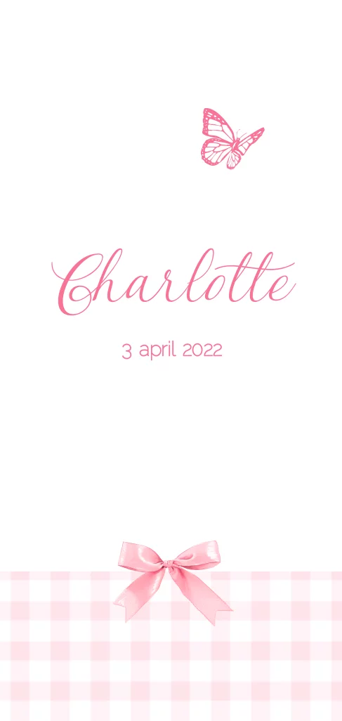 Een super leuk klassiek kaartje met roze ruitjes en een strikje. Hoe schattig is het vlindertje boven de naam!