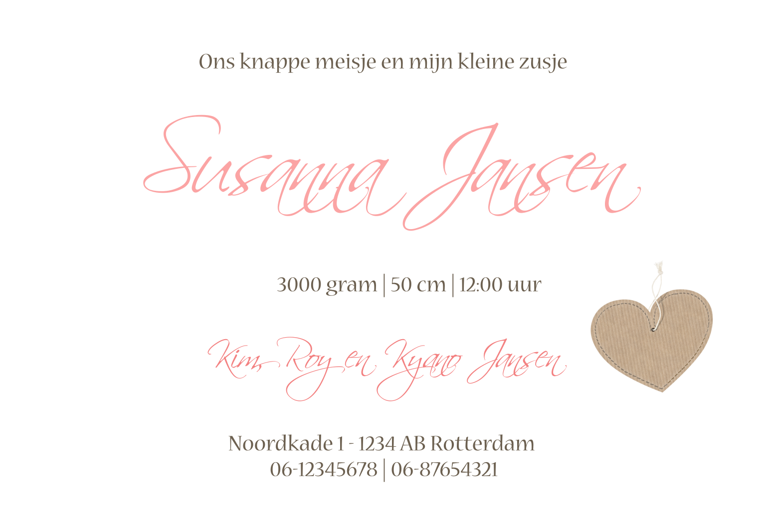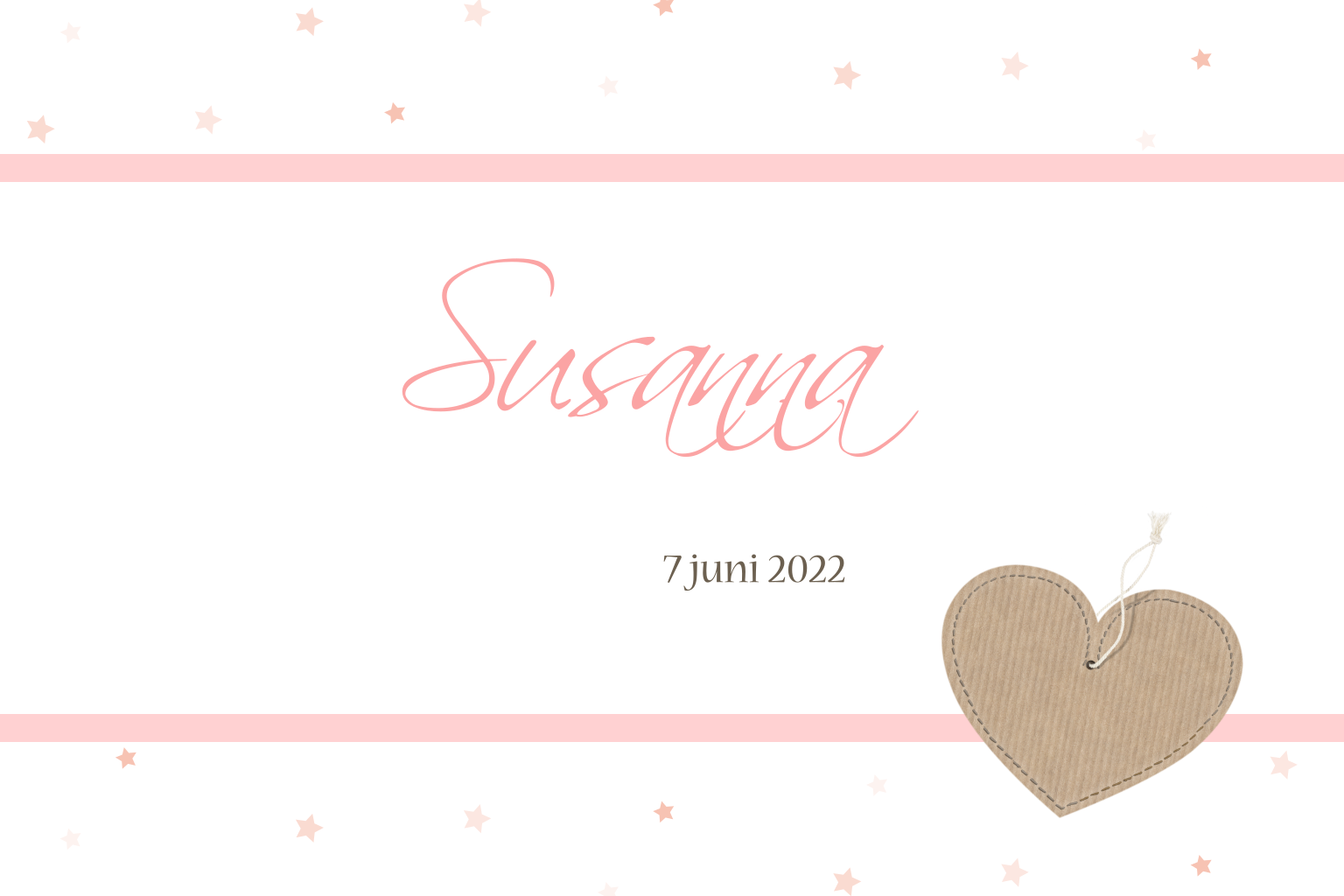 Een leuk klassiek geboortekaartje met roze sterretjes en een kraft hartje.
