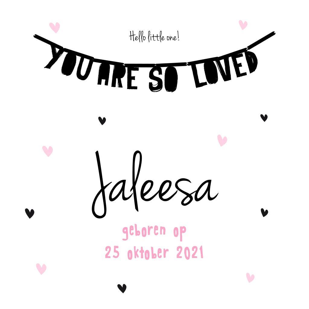 Stoer geboortekaartje voor meisje met letterbanner, zwarte en roze hartjes en speelse typografie. Dit kaartje is ook verkrijgbaar in een jongensversie.