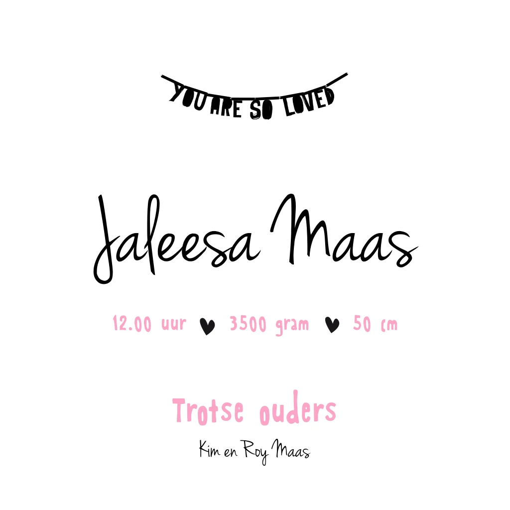 Stoere letterbanner met roze hartjes op geboortekaartje