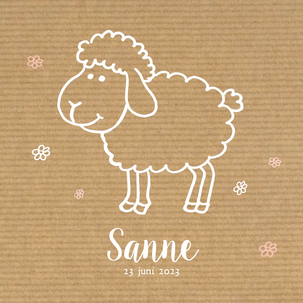 Lief en hip geboortekaartje voor een meisje met schaapje en bloementjes. Op een kraft look achtergrond. (280)