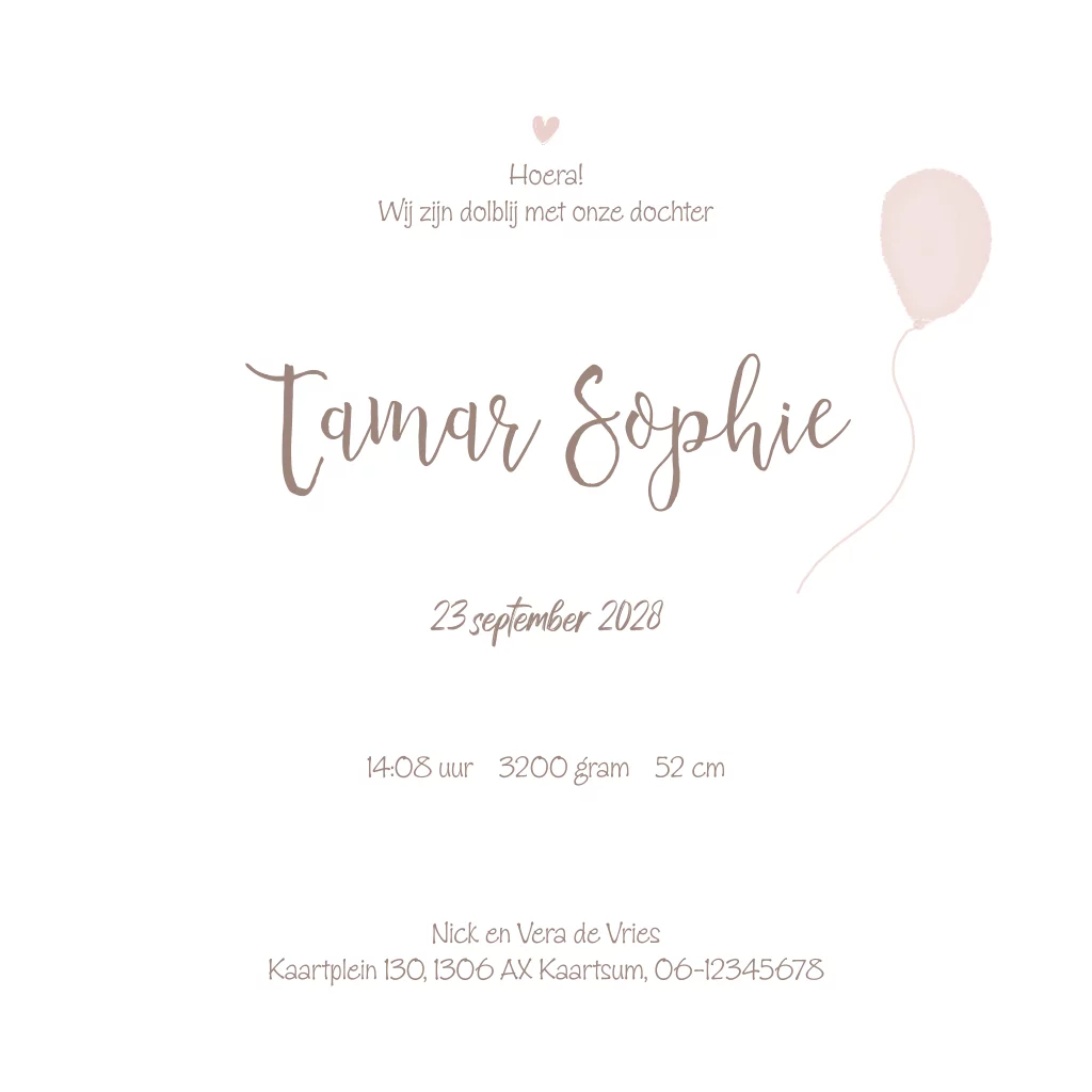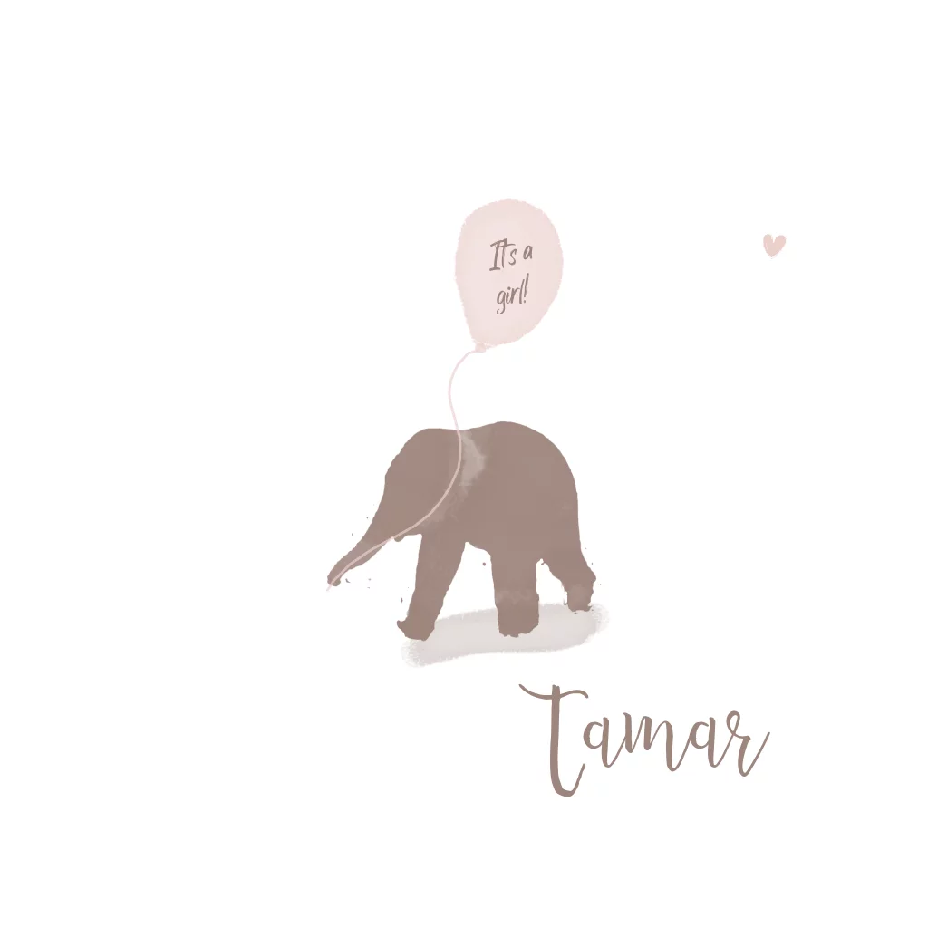Geboortekaartje met een olifantje en een ballon.