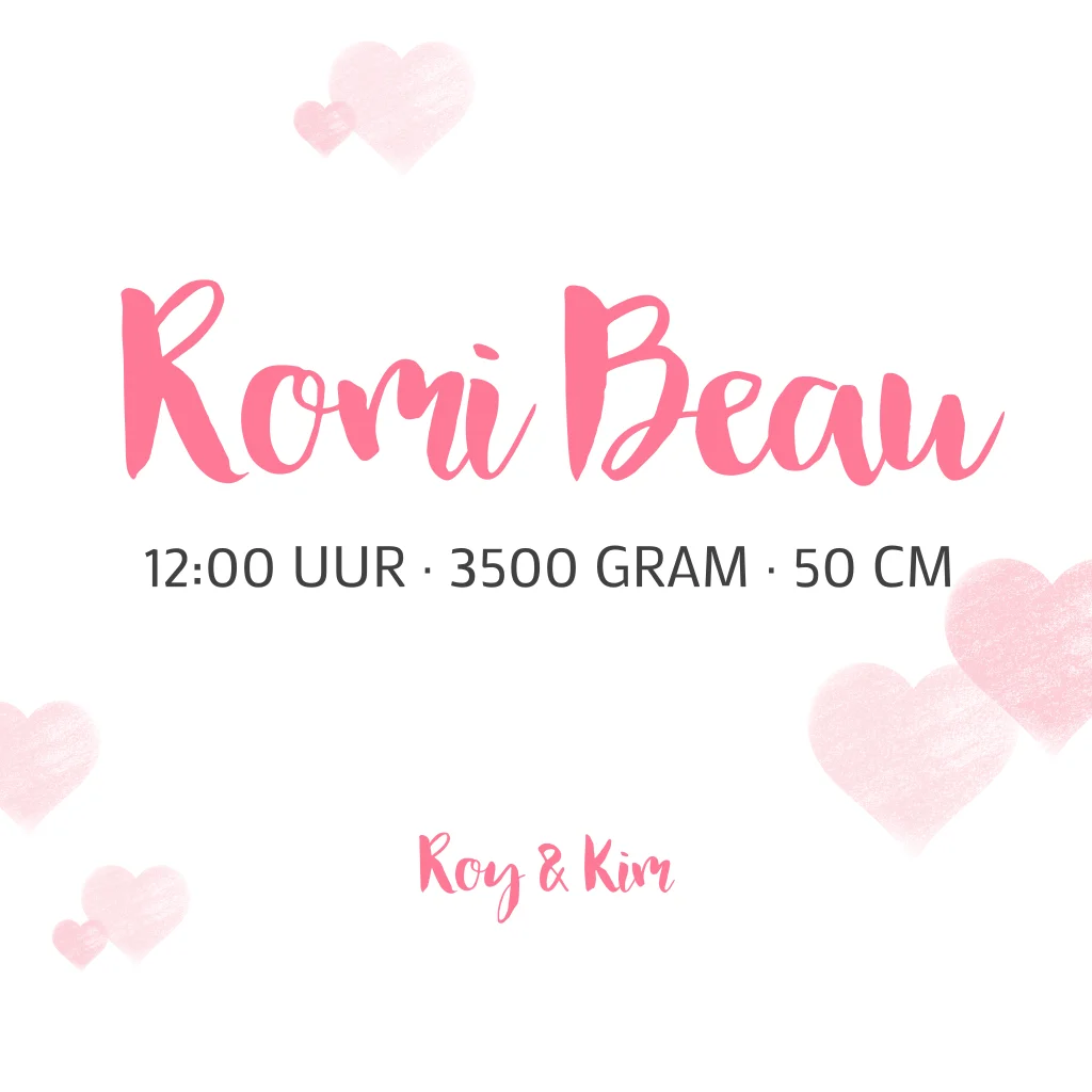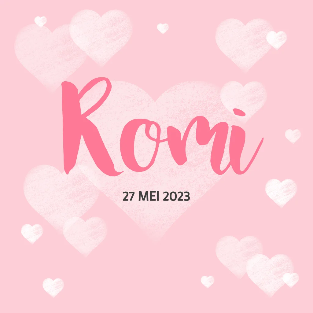 Simpel geboortekaartje met zeefdruk hartjes op een rozekleurige achtergrond. De harten zie je ook aan de binnenkant terugkomen, maar dan zijn de hartjes roze.