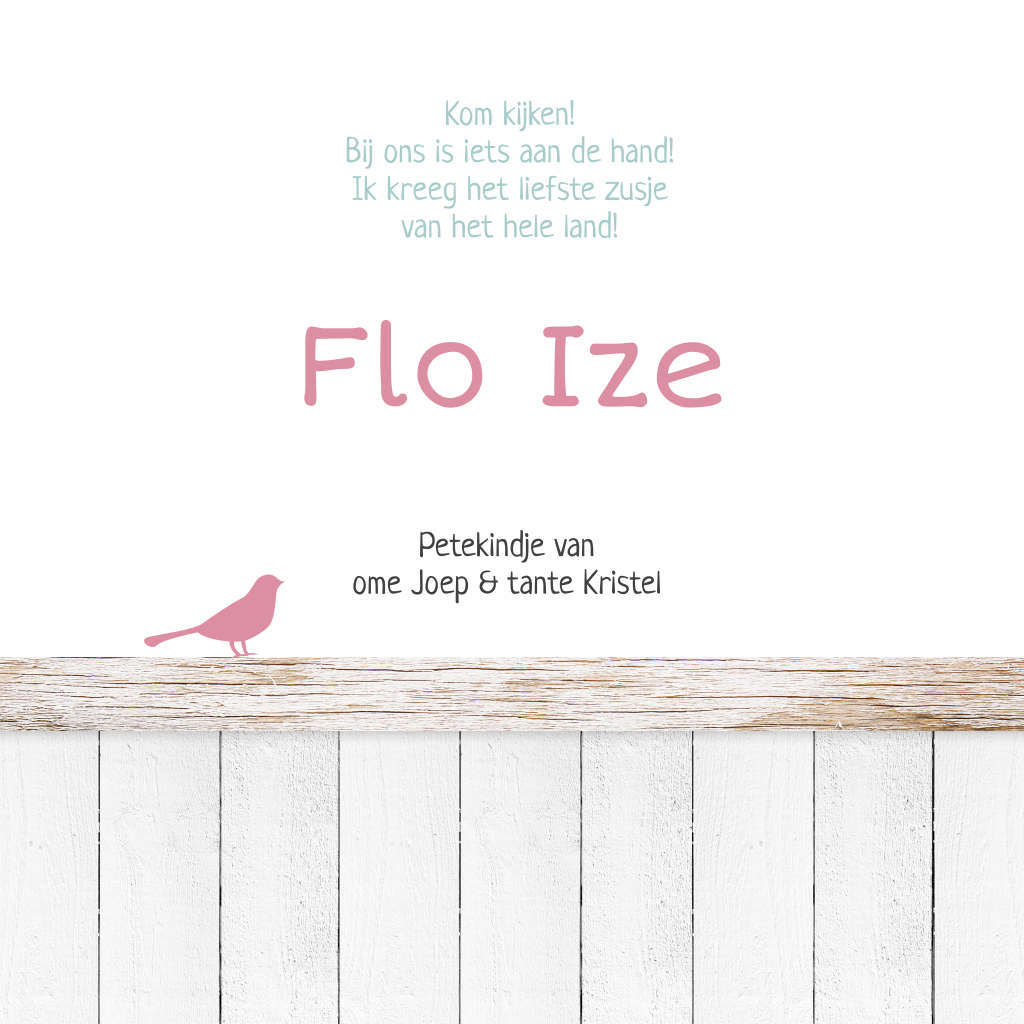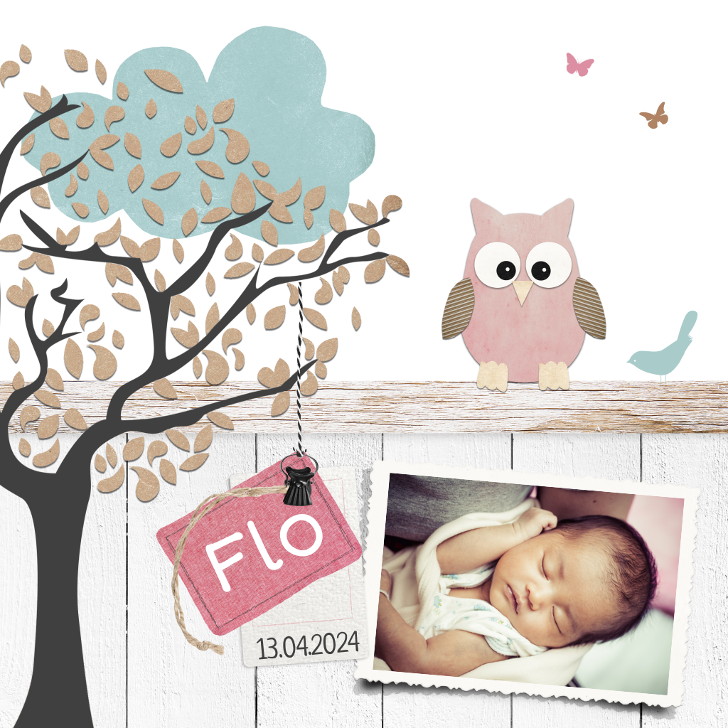 Lief geboortekaartje met boom, uiltje en hout look. Voor een meisje met foto. (3932)