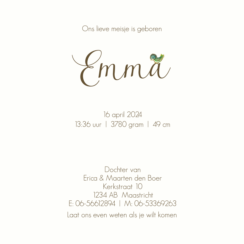 Lief geboortekaartje meisje met hertje en vogeltje in een bloemen krans. (3851)