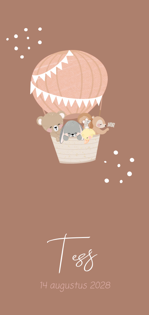 Geboortekaartje voor een meisje met luchtballon en schattige bosdieren in het mandje. (4531)