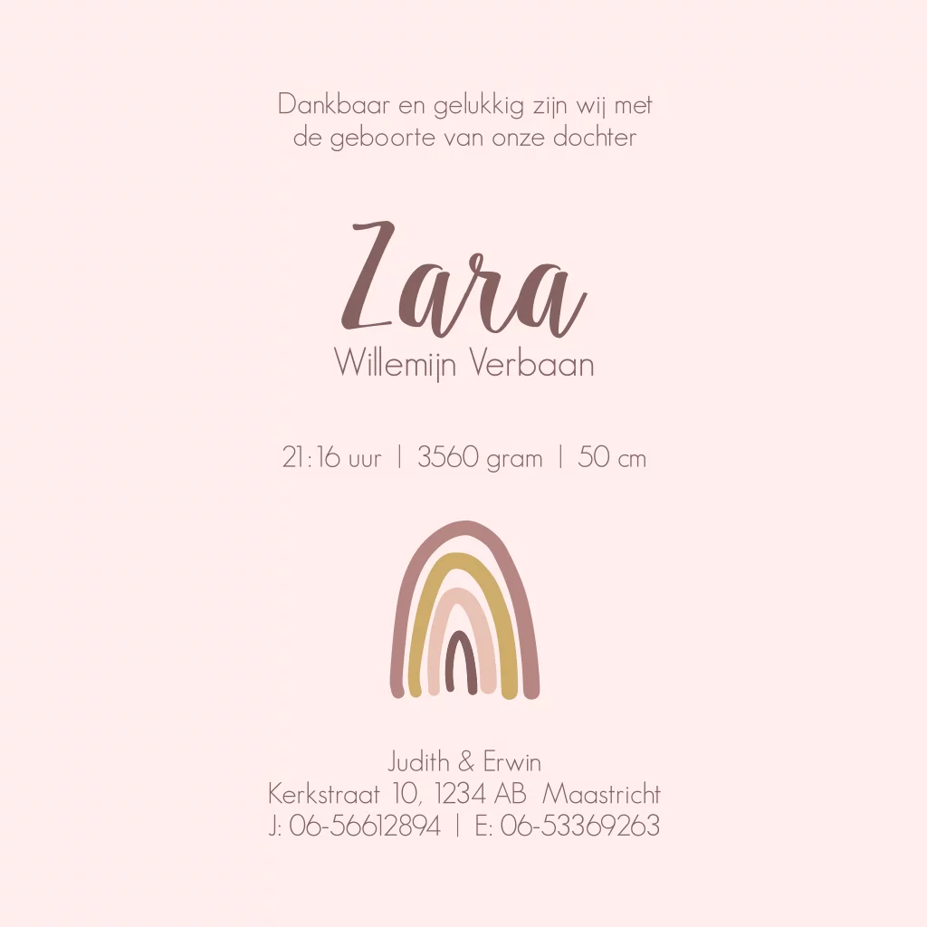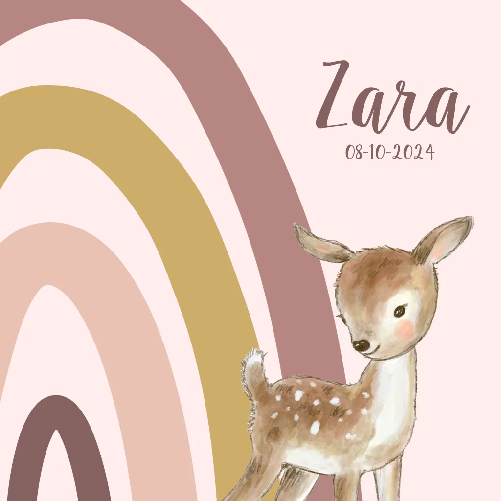 Lief geboortekaartje meisje met regenboog roze en hertje