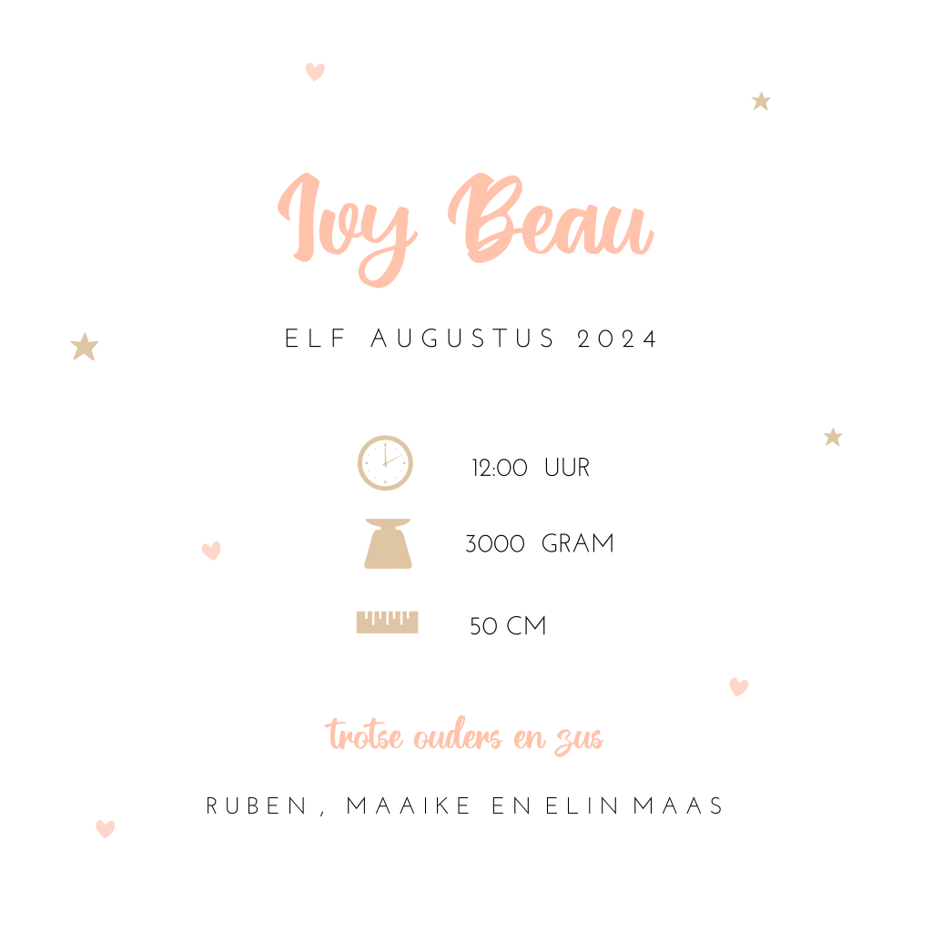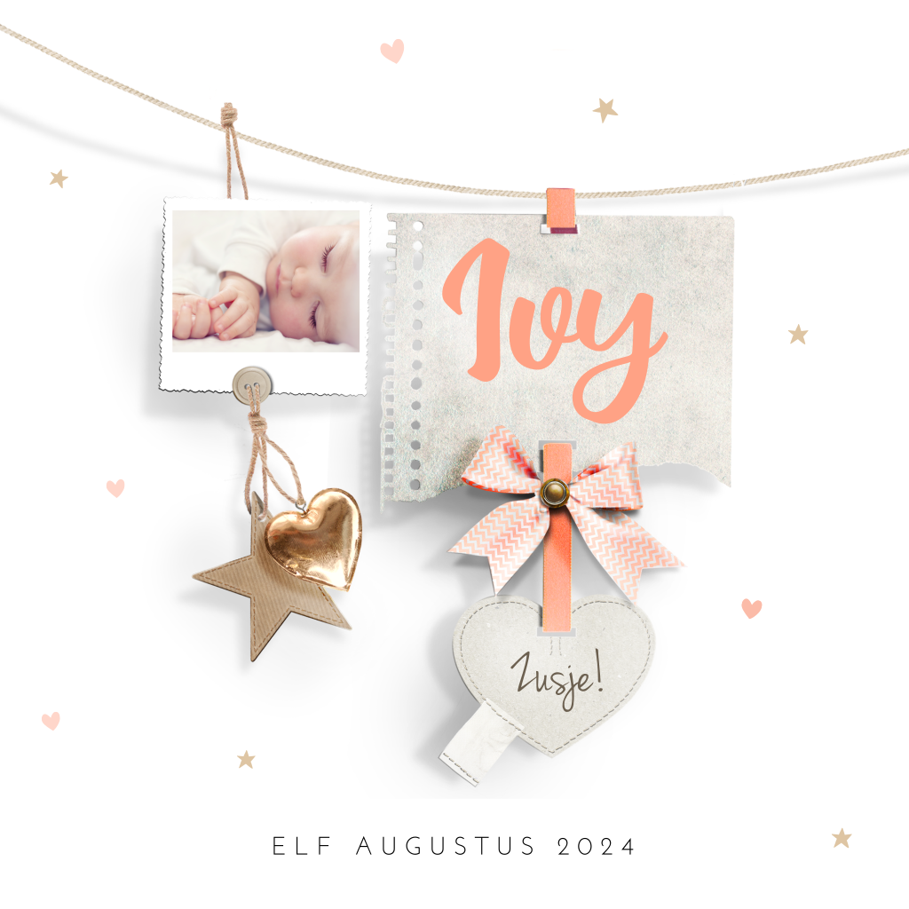 Lief geboortekaartje met waslijn foto, hartjes en ster