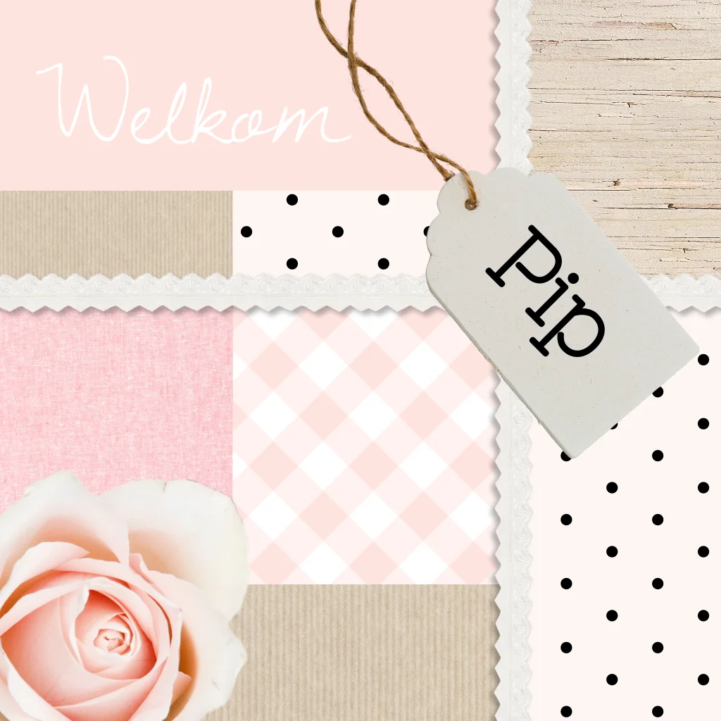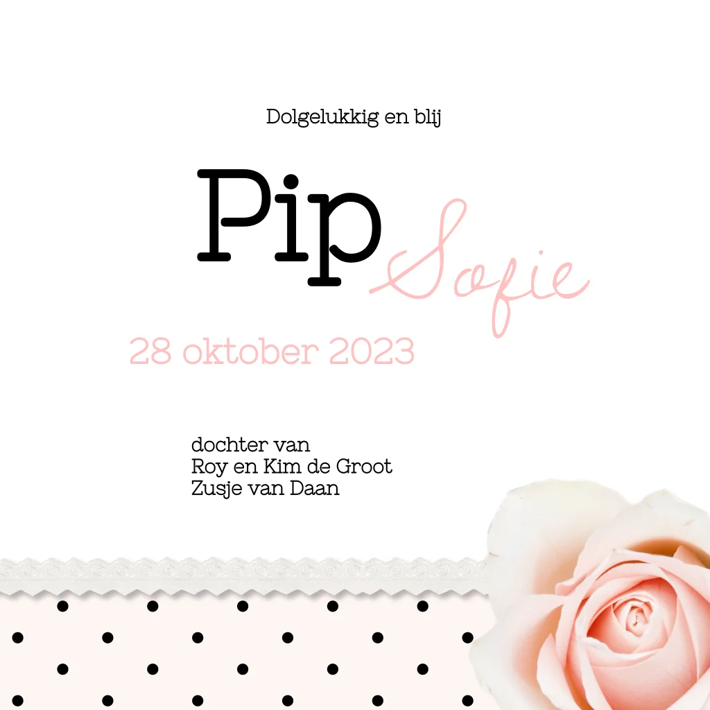 Lieve geboortekaart met roos en leuke kanten lintjes. Op de label schrijf je de naam van jouw meisje.
