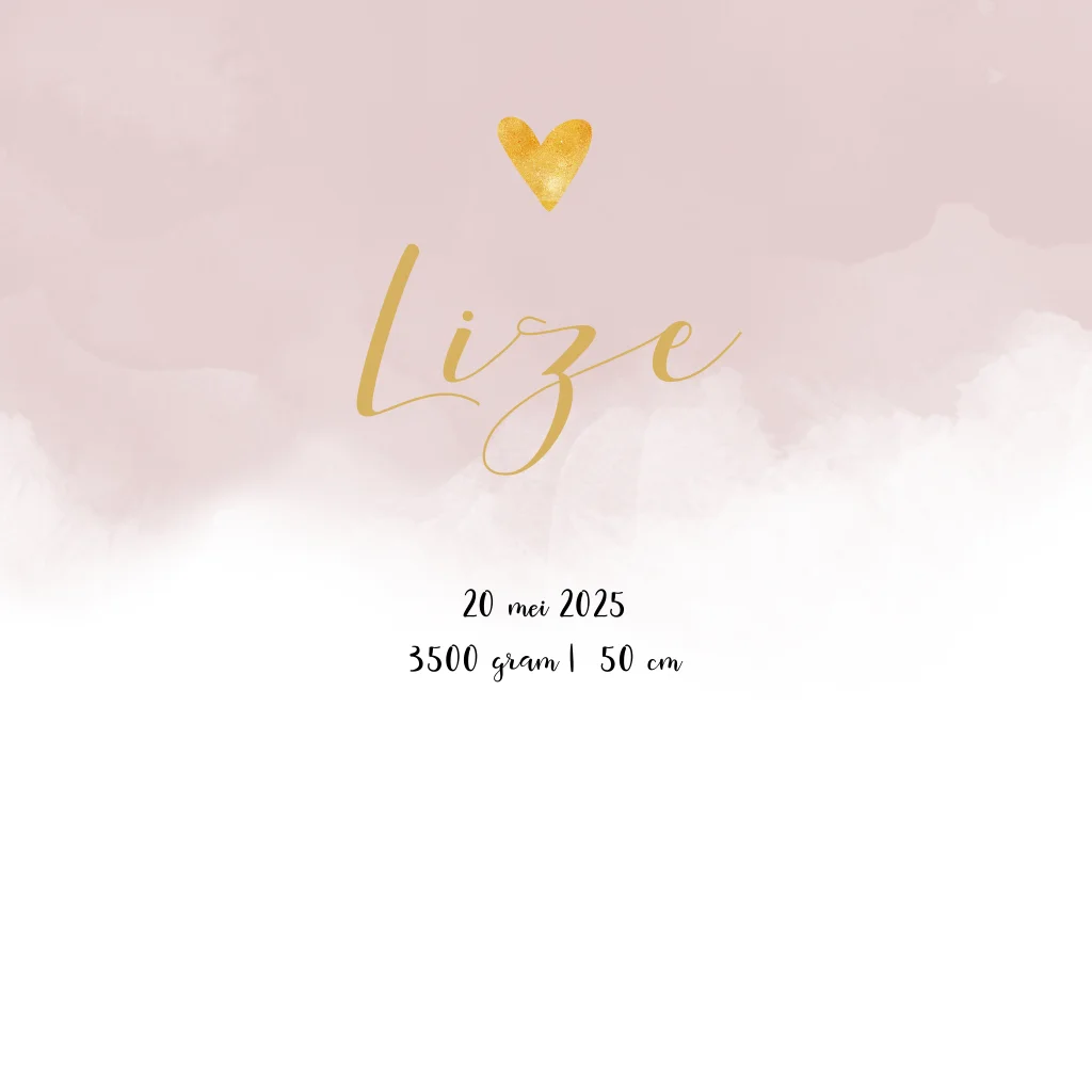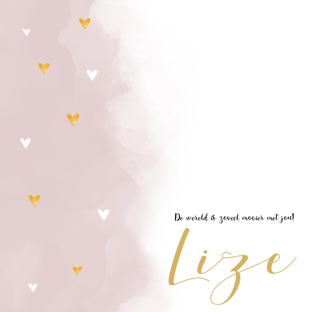Lief geboortekaartje meisje met goudkleurige hartjes en roze waterverf. (227)