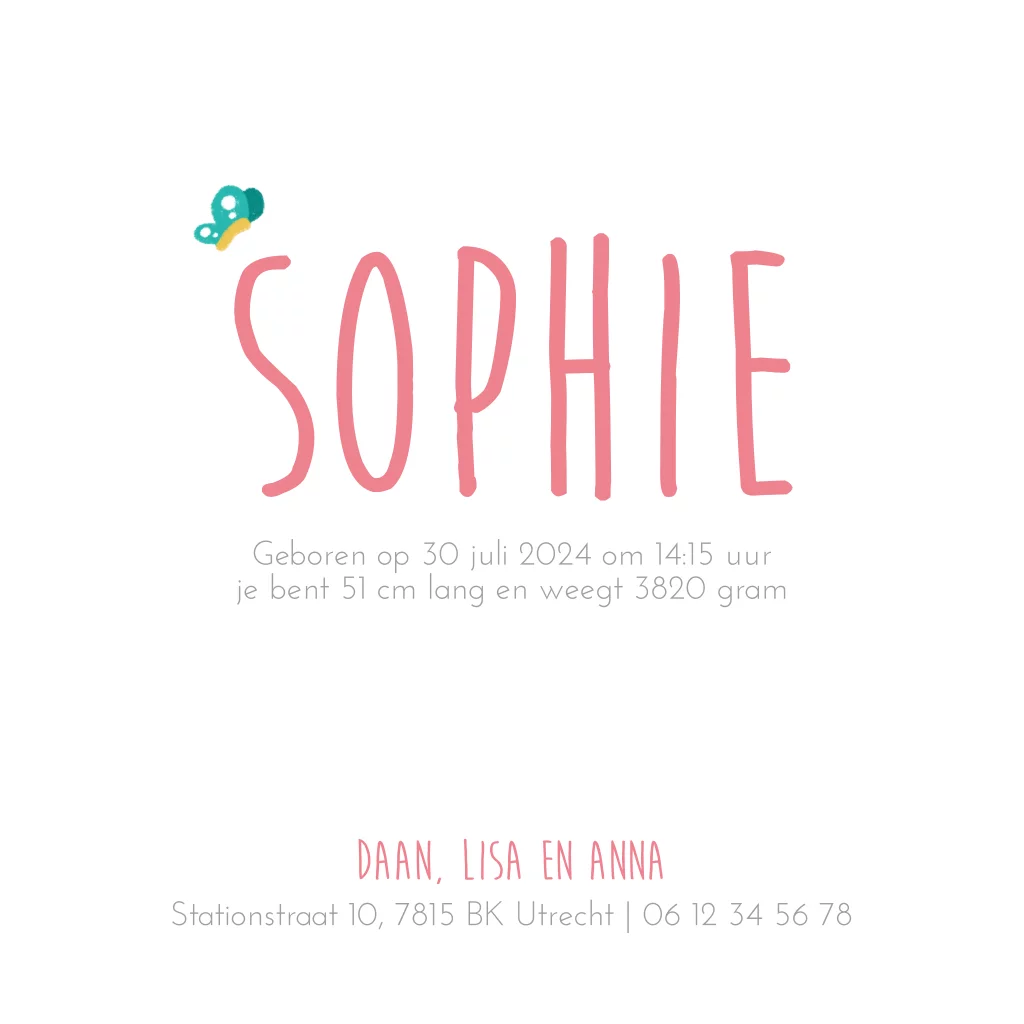 Lief geboortekaartje in roze tinten voor een meisje. Met een getekende flamingo en vlindertjes. Alle elementen op de kaart zijn los en naar wens aan te passen. (3561)