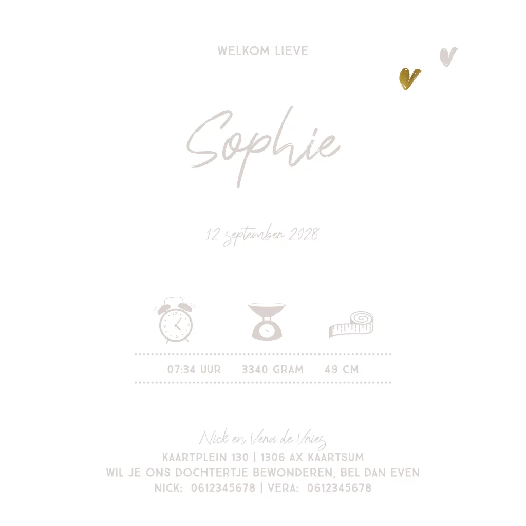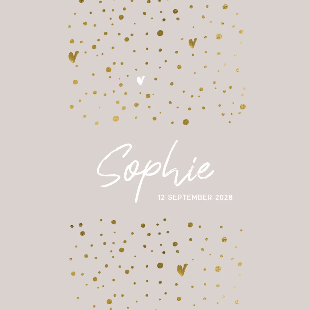 Zandkleurig geboortekaartje voor een meisje met foliedruk stippen en hartjes.
