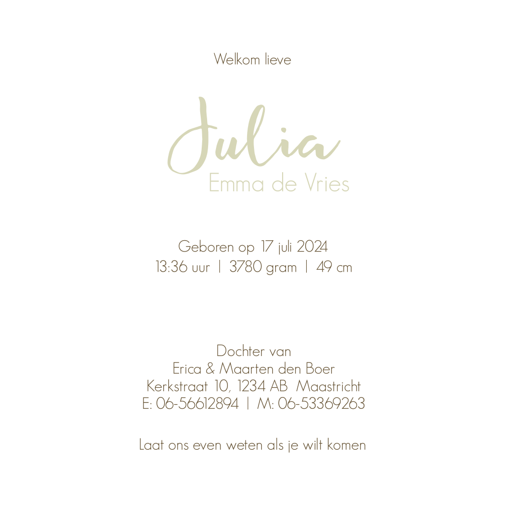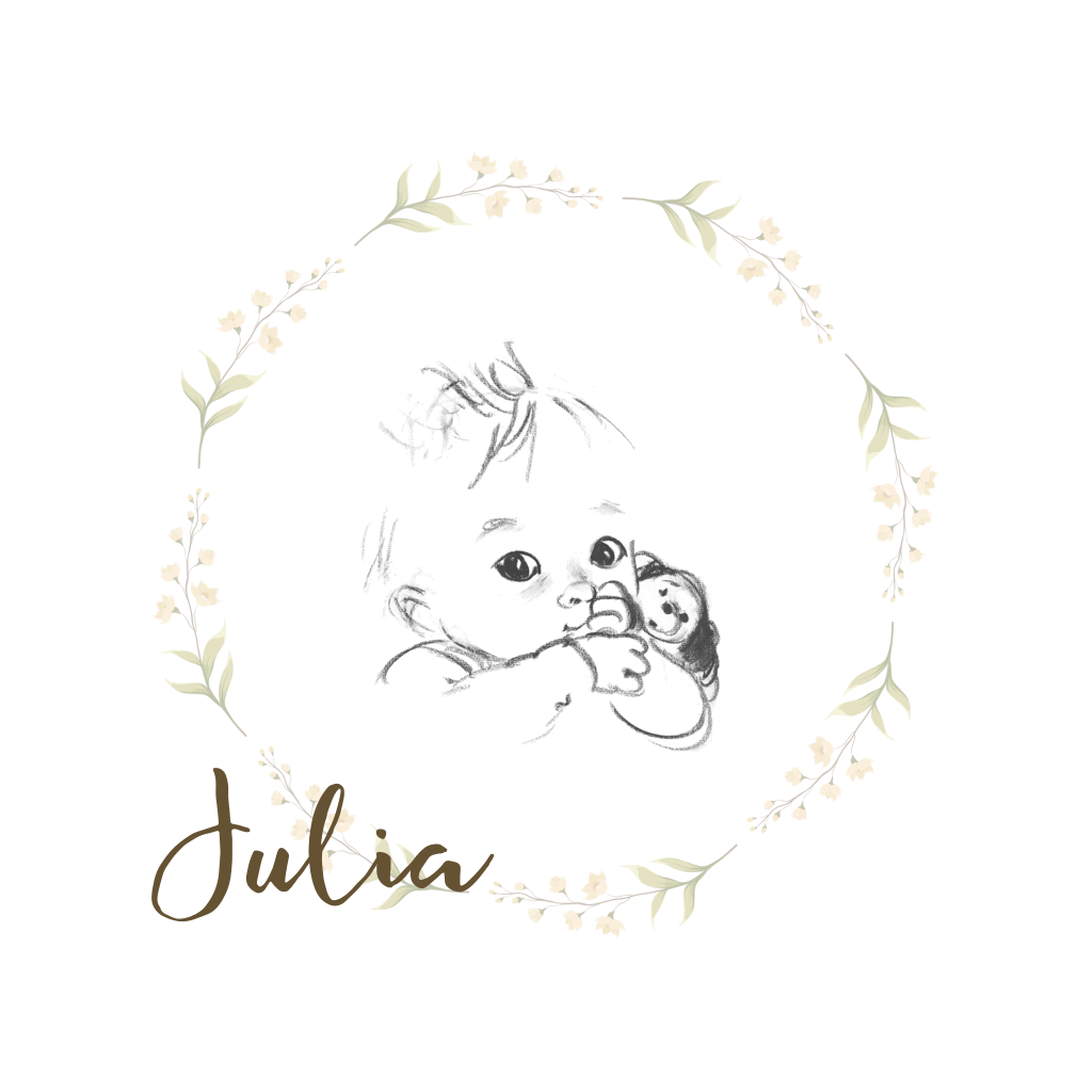 Lief getekend geboortekaartje meisje met baby en knuffel in een krans van bloemen en takjes. (3852)