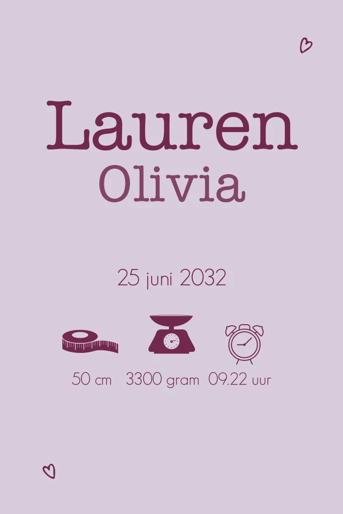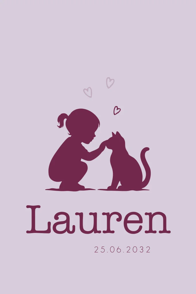 Een schattig geboortekaartje met een meisje en kat in het paars. Personaliseer het ontwerp in onze online editor. Uit de speciale huisdieren collectie 'Thuis is met jou 🐾.