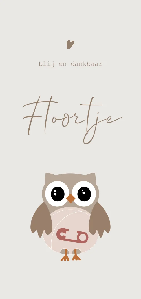 Lief geboortekaartje voor een meisje in aardetinten met een uil.