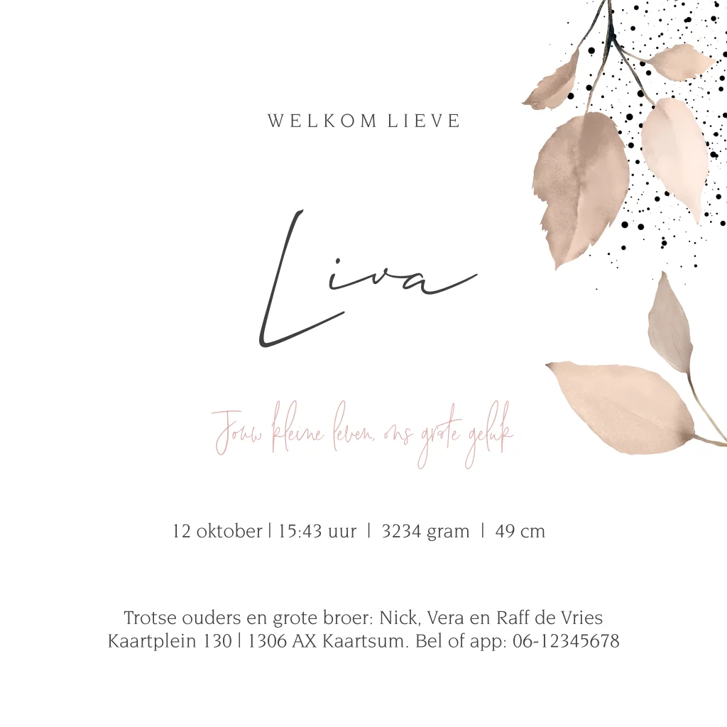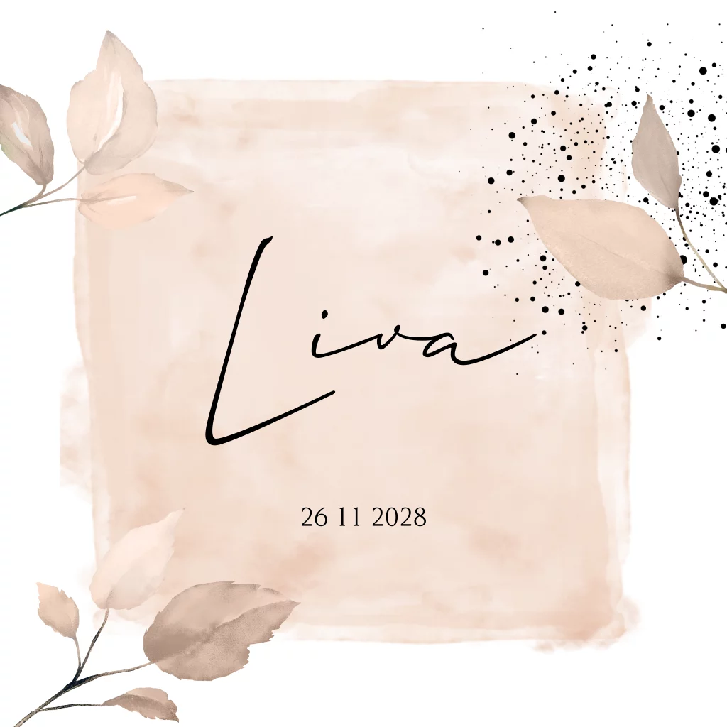 Hip geboortekaartje voor een meisje met aquarel bladeren in roze kleur.