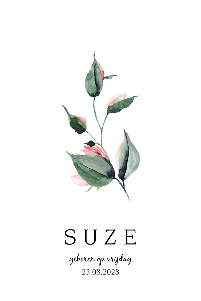Geboortekaartje minimalistisch met roze bloem en bladeren.