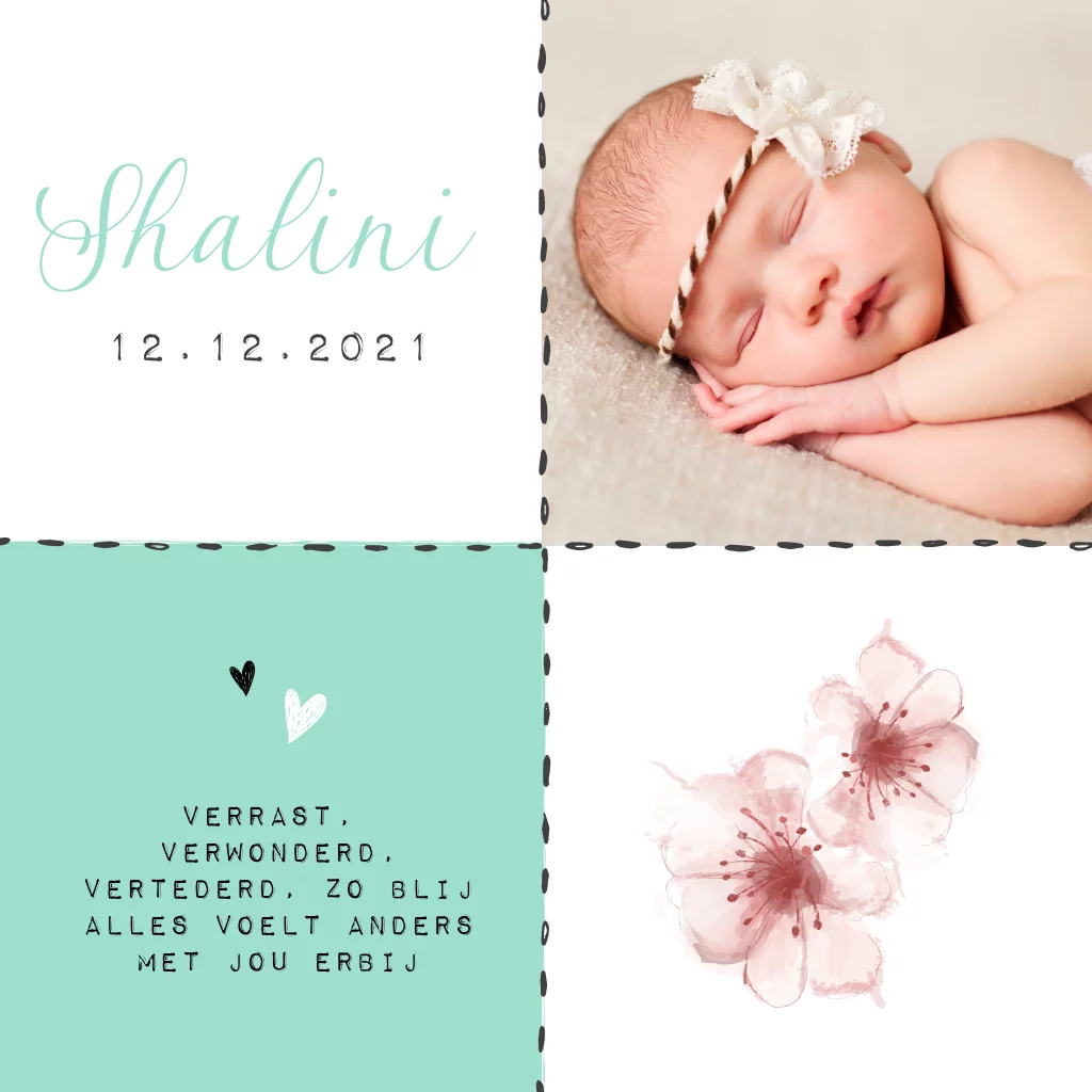 Dit ziet er lekker fris uit! Dit hippe geboortekaartje met mintgroene kleuren in het vierluik met een foto en geschilderde voetjes past bij moderne ouders.