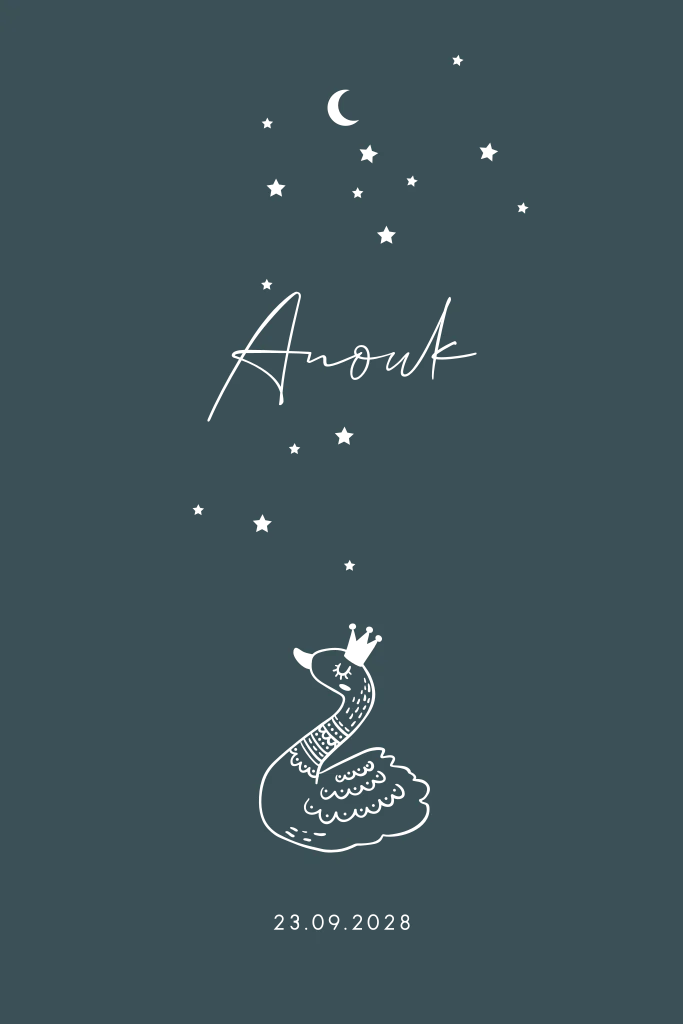 Geboorte kaartje meisje modern met foliedruk zwaantje, sterretjes en maan.
