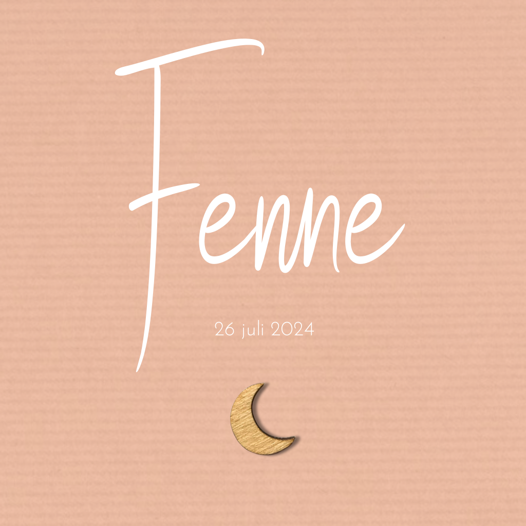 Hip en modern geboortekaartje voor een meisje met een echt houten maantje. (3565) LET OP! Bij de proefdruk en eindbestelling wordt GEEN voorbeeld vormpje geleverd. Het houten vormpje op dit kaartje wordt niet mee gedrukt, deze is ter voorbeeld. Op die plek kun je straks zelf het Γ©chte houten vormpje plakken die je in het bestelproces bij dient te bestellen.