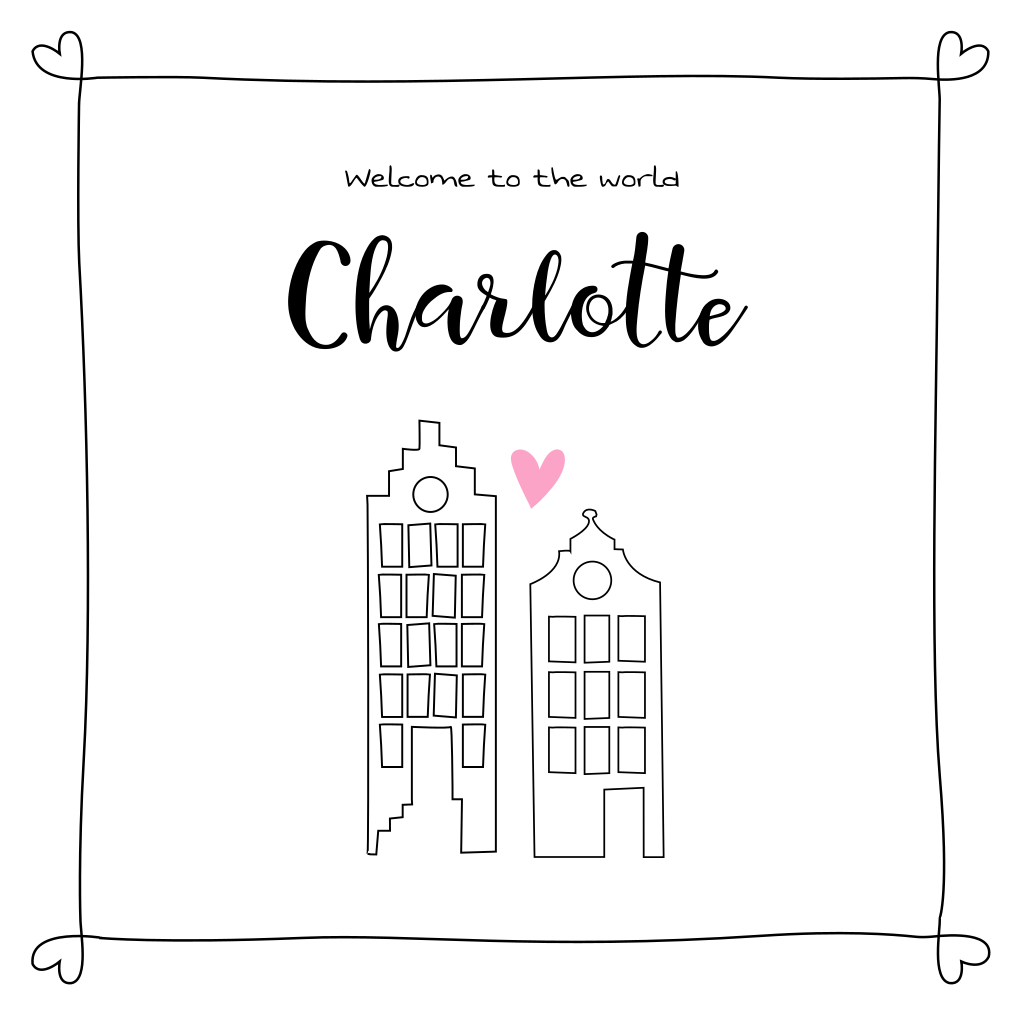 Geboortekaartje meisje met moderne huisjes en hartjes. (3937)