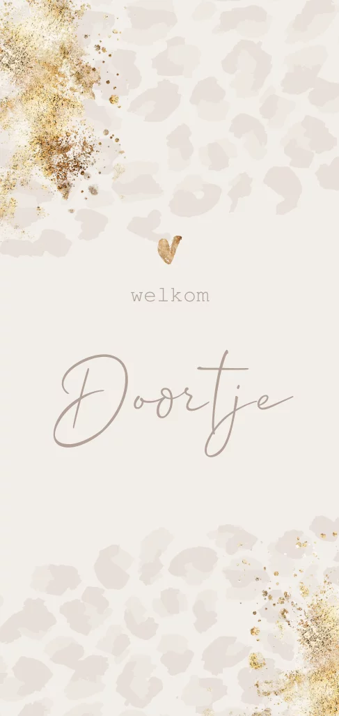 Hip geboortekaartje meisje met jungle patroon en goud kleurige spetters.