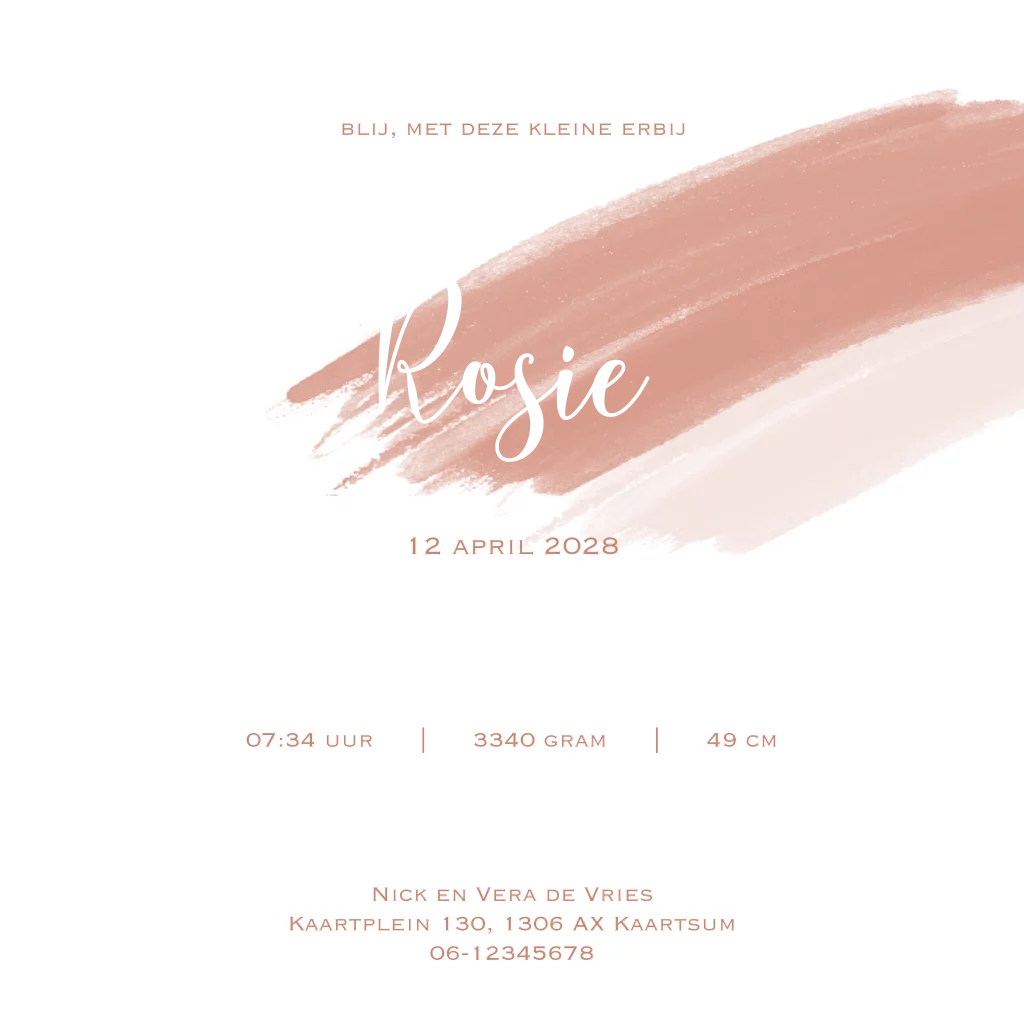 Hip geboorte kaartje meisje met verf strepen roze goud look.