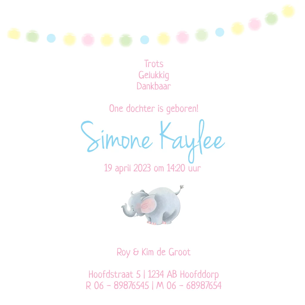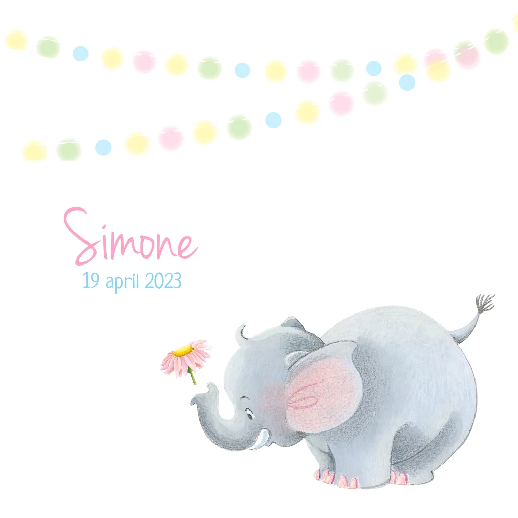 Vind je olifantjes ook zo lief? Dit kaartje heeft een lieve slinger en je ziet een baby-olifantje een bloemetje wegblazen. Pas het kaartje zelf aan in onze editor.
