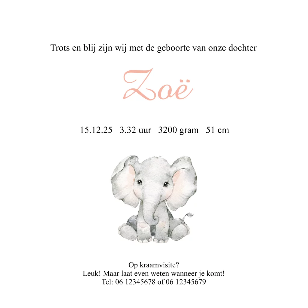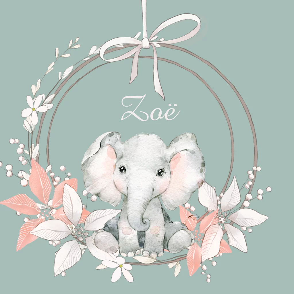 Olifantje geboortekaartje voor een meisje met getekende bloemen. De mooi groene kleur op de achtergrond is wel naar wens aan te passen. (3730)