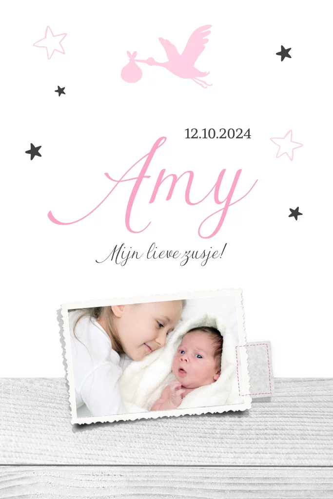 Sterretjes, hout, een foto en een ooievaar: alle elementen voor een leuk geboortekaartje zitten erin. Samen met een leuke sluitzegel maak je de kaart compleet. . Dit geboortekaartje heeft standaard ronde hoeken (meerprijs โฌ 0,25). Wil je rechte hoeken? Neem contact met ons op.