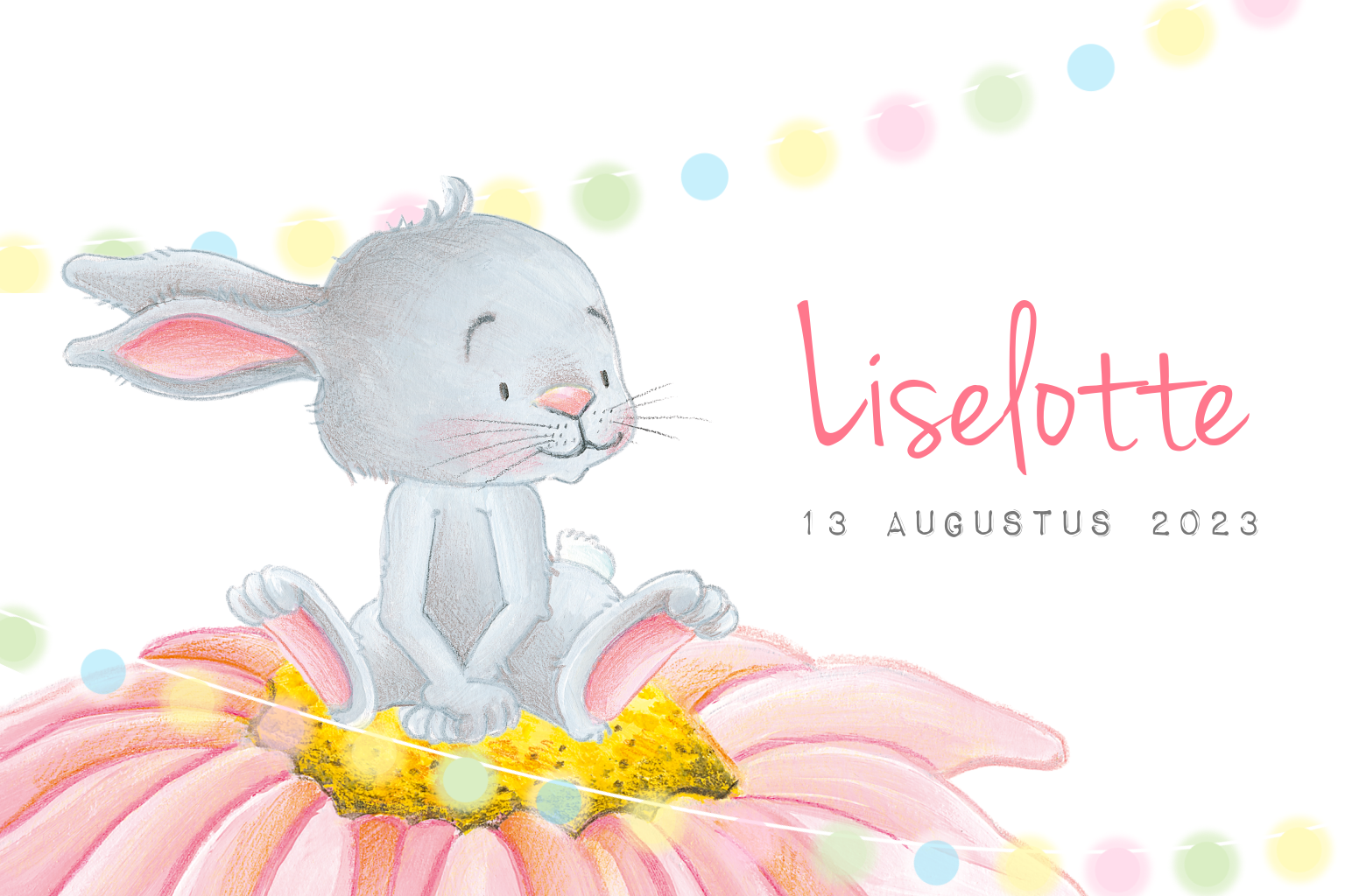 Lief geboortekaartje dat origineel uit de hoek komt met een getekend konijntje op een bloem. Wil jij een ander diertje op de bloem plaatsen? Dat kan! Vervang het konijntje voor een ander diertje, of vraag ons om advies.