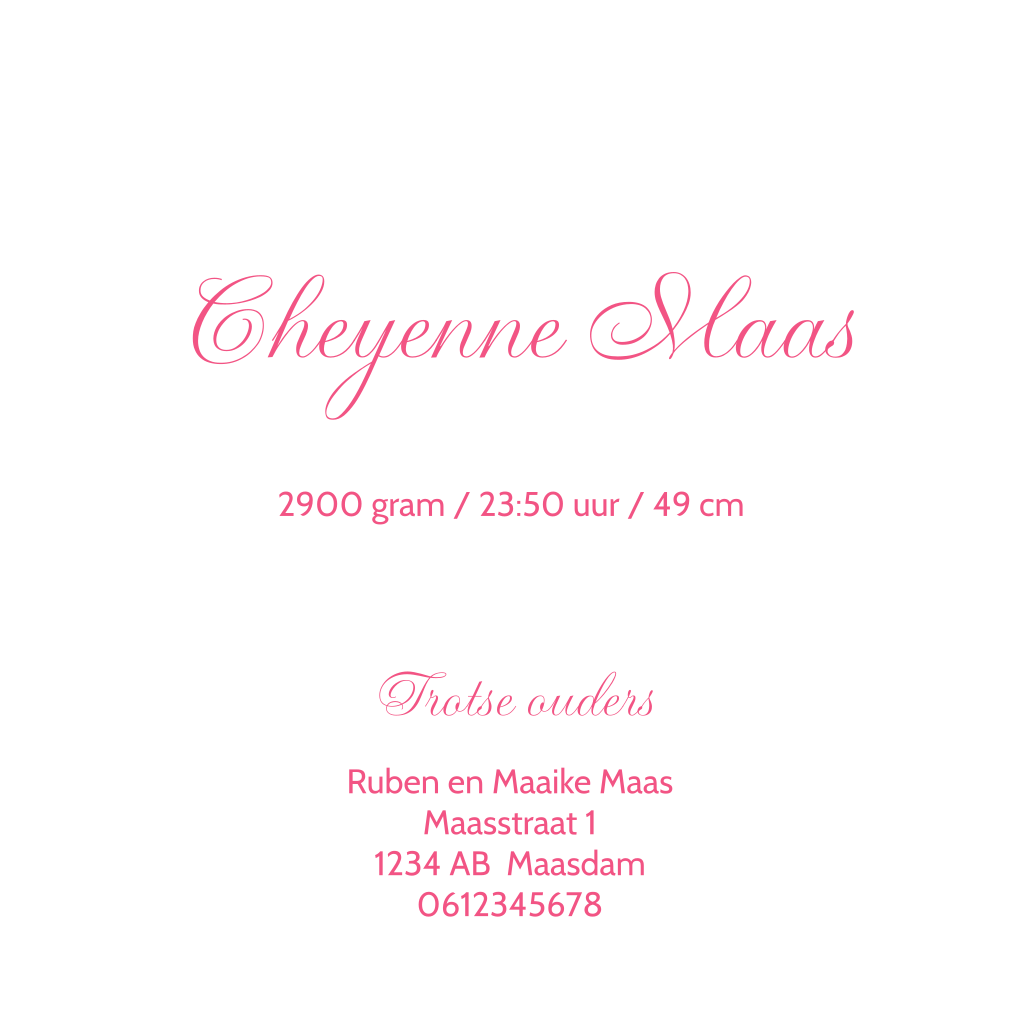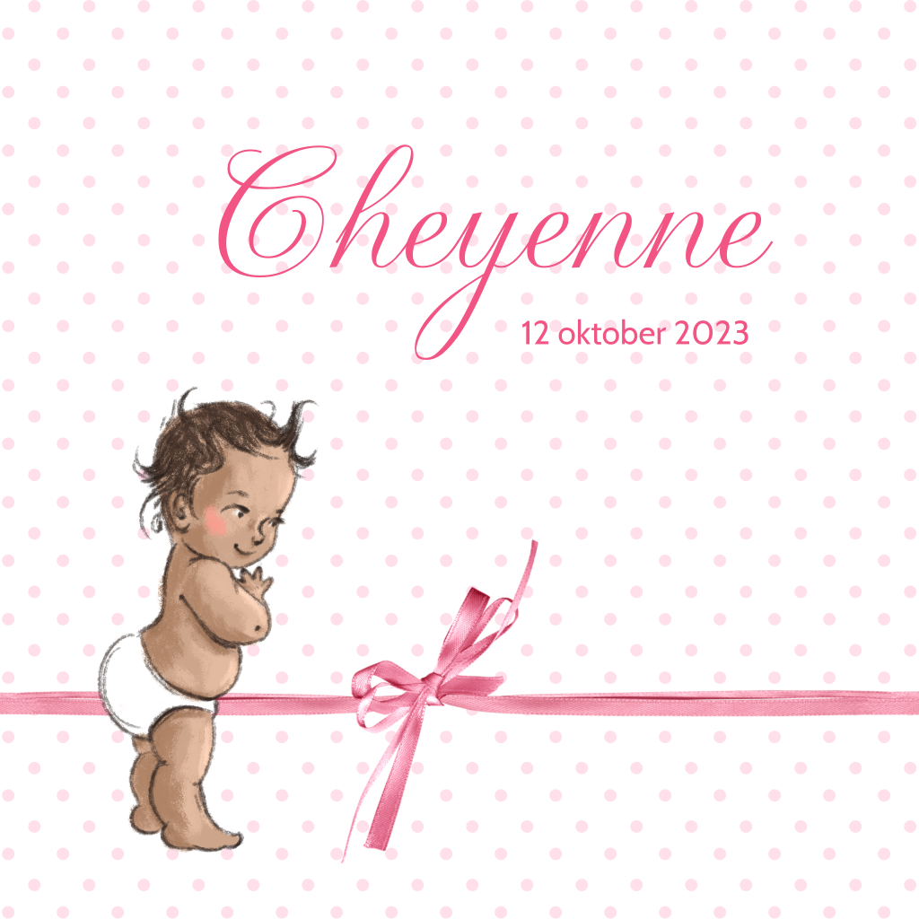 Geboortekaartje met poezieplaatje van een baby. Leuk babykaartje met klassieke roze stipjes en lintje.