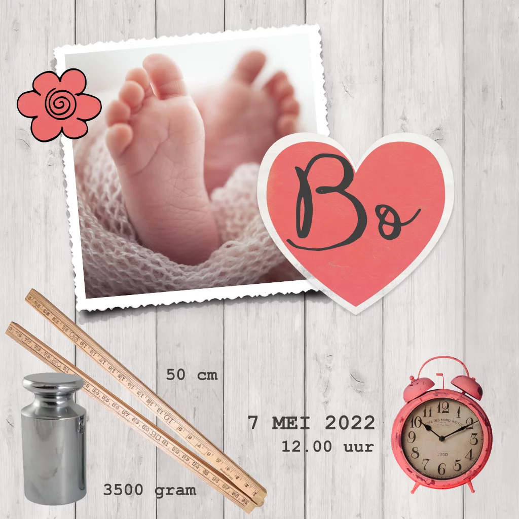 Fleurig geboortekaartje voor een meisje met rode elementjes, zoals het wekkertje, het hart en de bloem die boven de foto staat. De houten achtergrond past er goed bij.