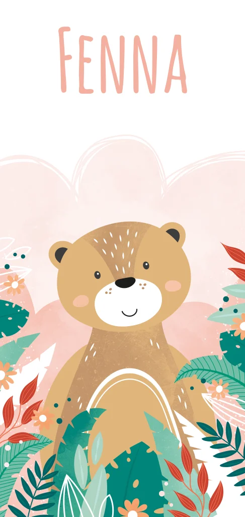 Langwerpig geboortekaartje voor een meisje in roze kleur. In jungle thema met jungle bladeren en op de voorkant een beertje. De achtergrond van het kaartje heeft een waterverf structuur. (8709). Dit geboortekaartje heeft standaard ronde hoeken (meerprijs € 0,25). Wil je rechte hoeken? Neem contact met ons op.