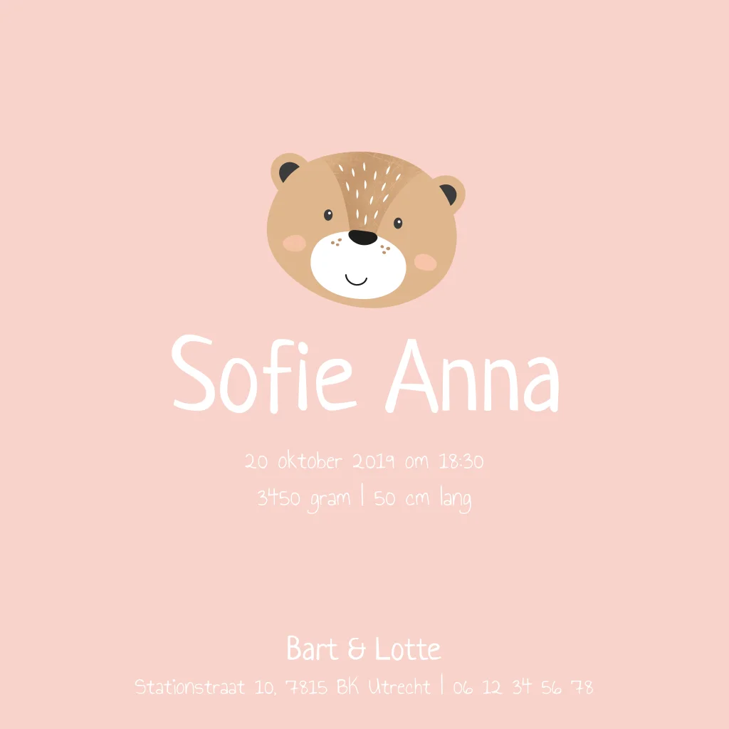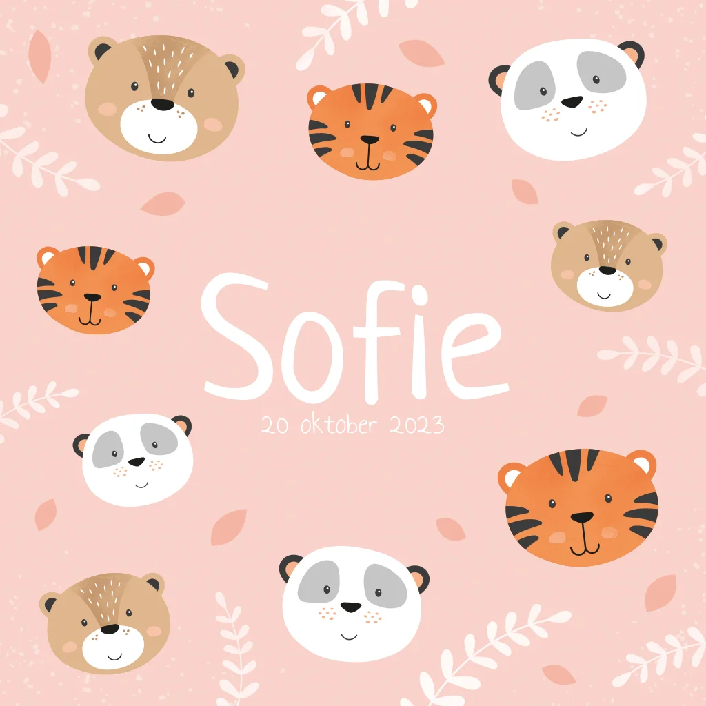 Vierkant gevouwen geboortekaartje voor een meisje in de kleur roze. Met verschillende dieren op de voorkant, tijger, beer en panda. Met daar omheen takjes en bladeren. Aan de binnenkant staat 1 van de dieren groot, deze kan je zelf kiezen. (3068)