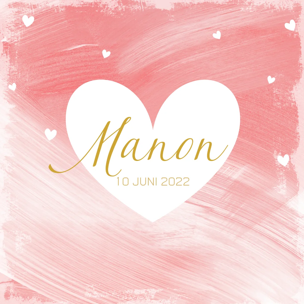 Mooi geboortekaartje voor een meisje met koraalkleurige verfstrepen en groot wit hart waarin de naam van jullie dochter gezet kan worden.